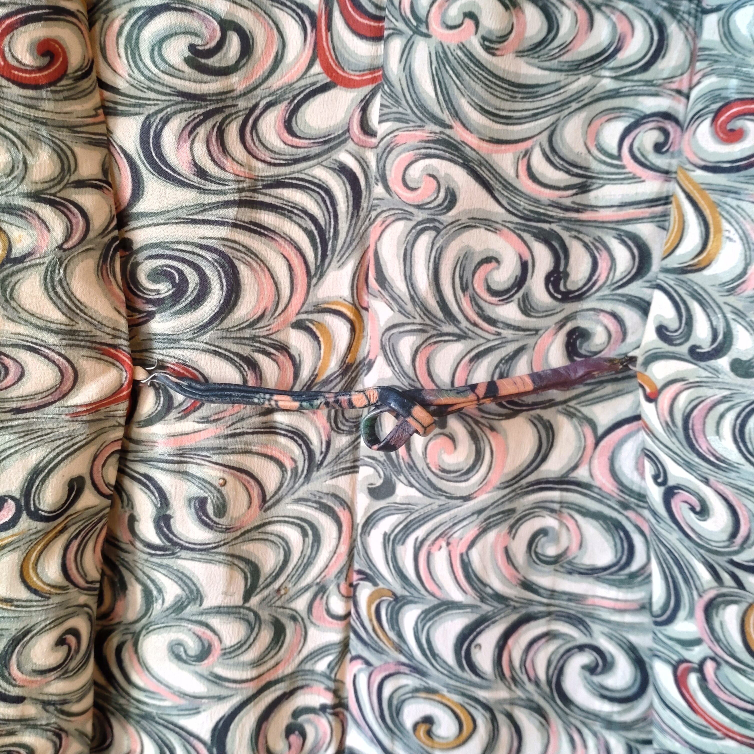 軽やかな流水紋の羽織です。画像だと分かりづらいですが、地紋も似た柄が入っていて繊細な美しさがあります。革の羽織紐が付いています。