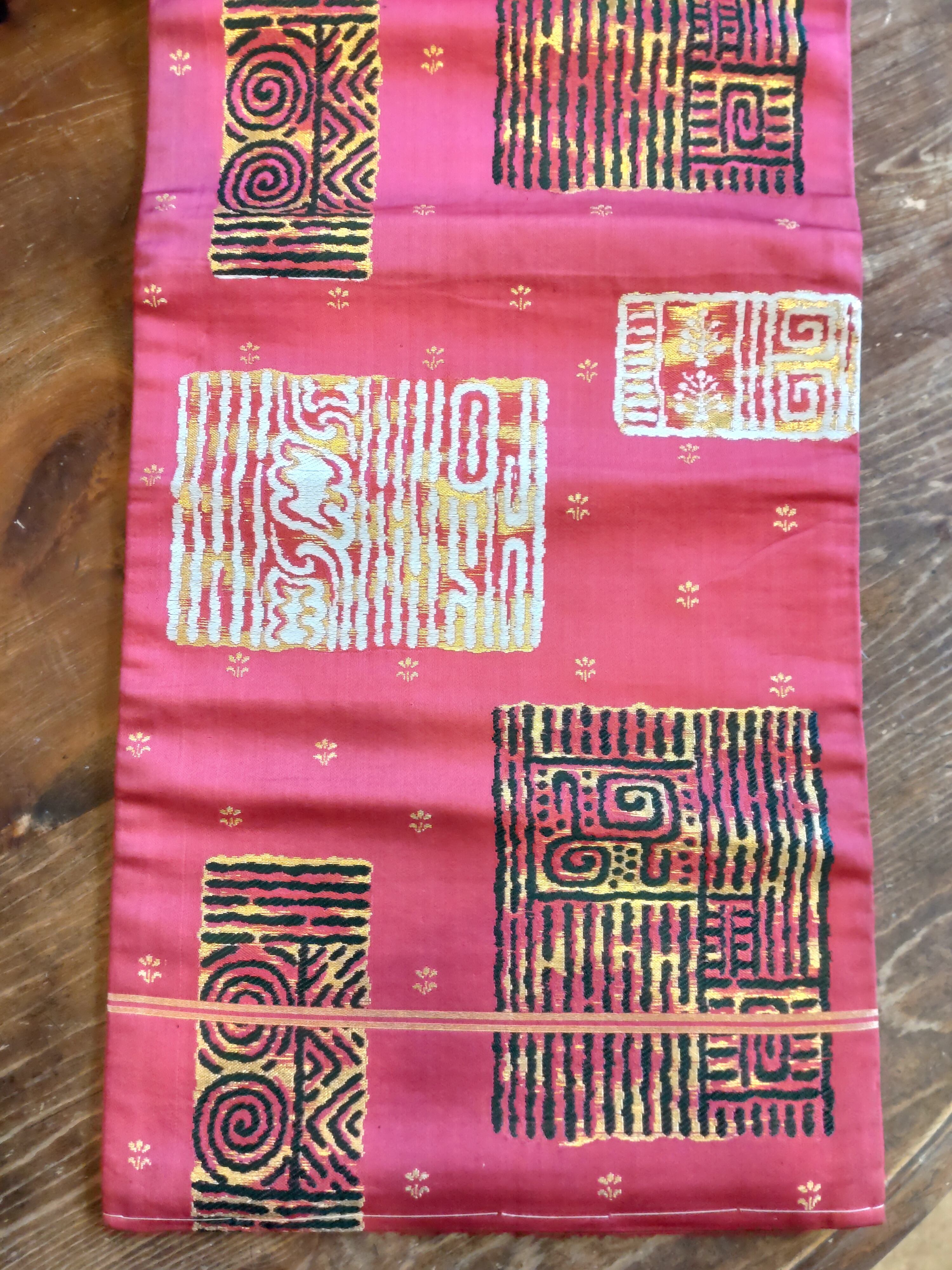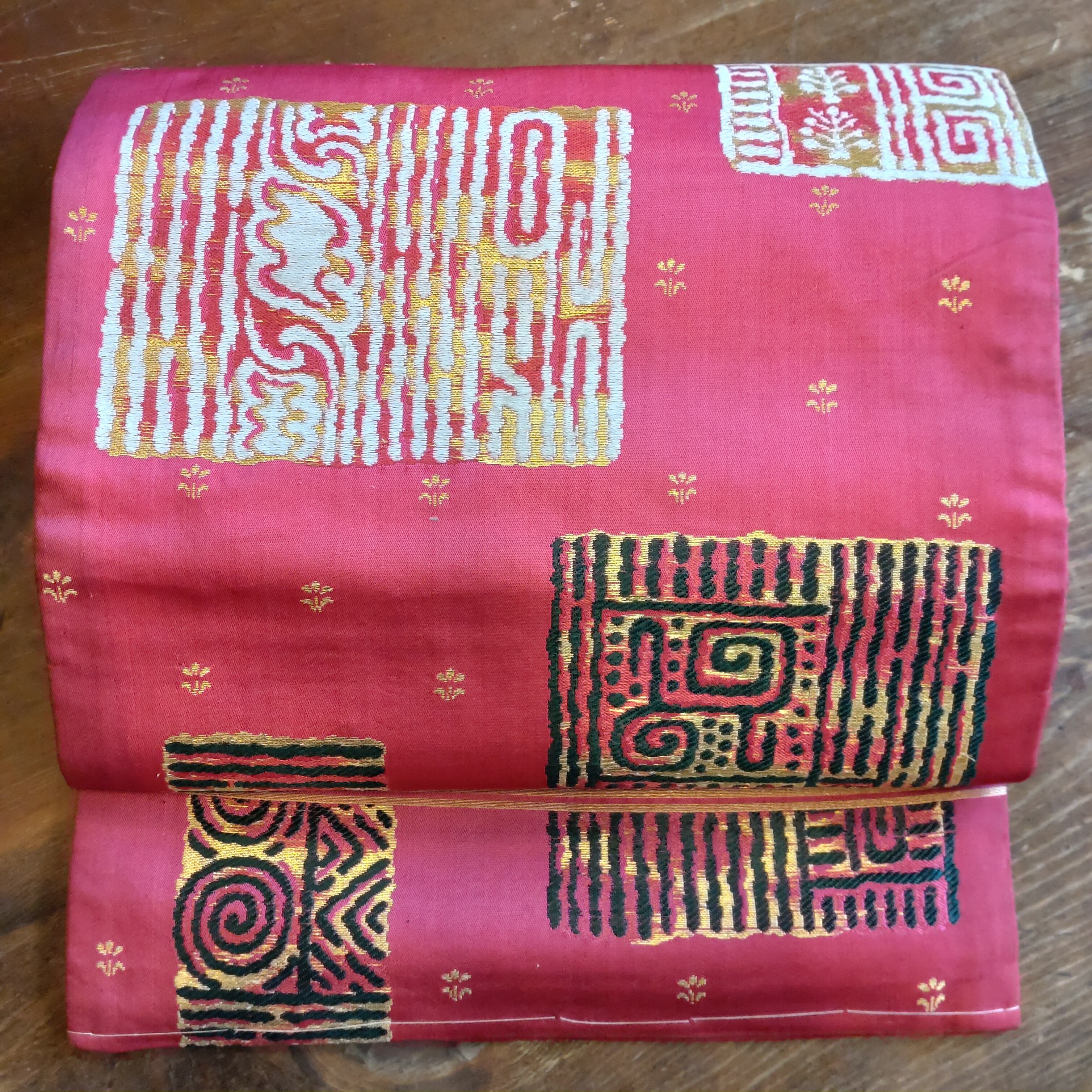 金印みたいな模様の名古屋帯です。濃いピンクに黒・白・ゴールドでコーディネートをピリ辛に。