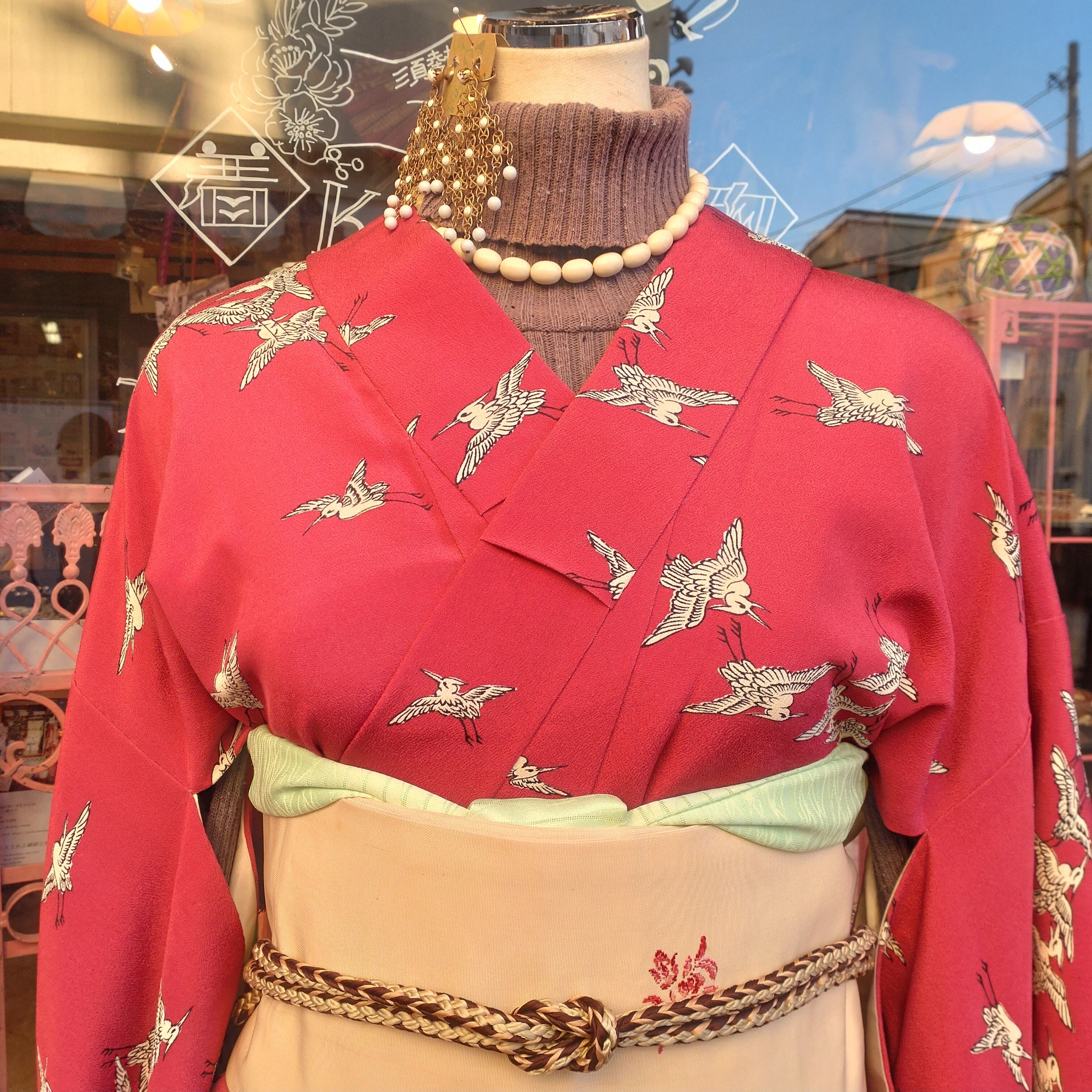 ラズベリーピンクにチャーミングな渡り鳥の袷着物です。身丈・コンディション◎