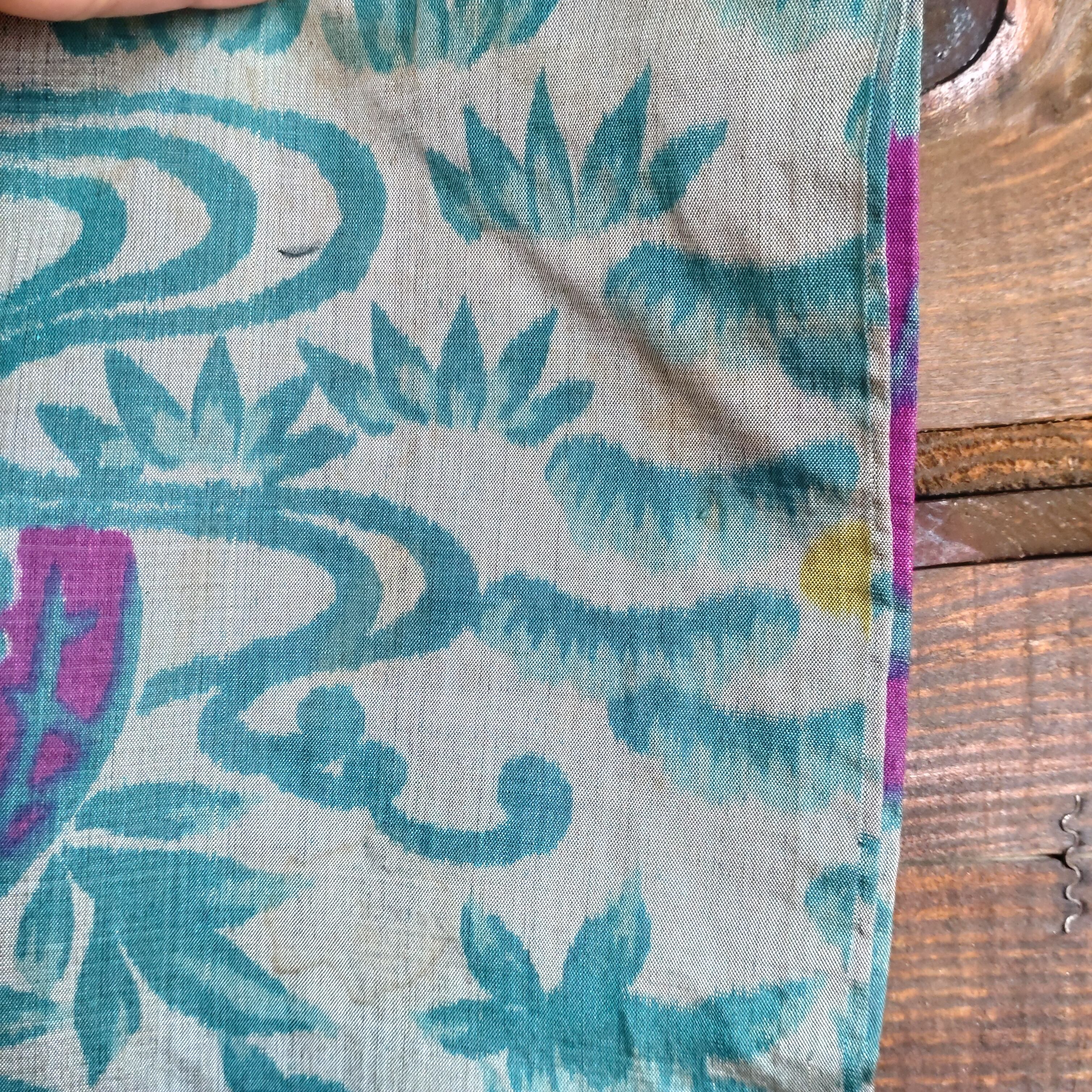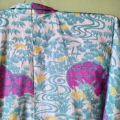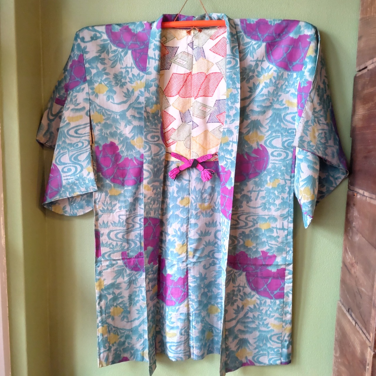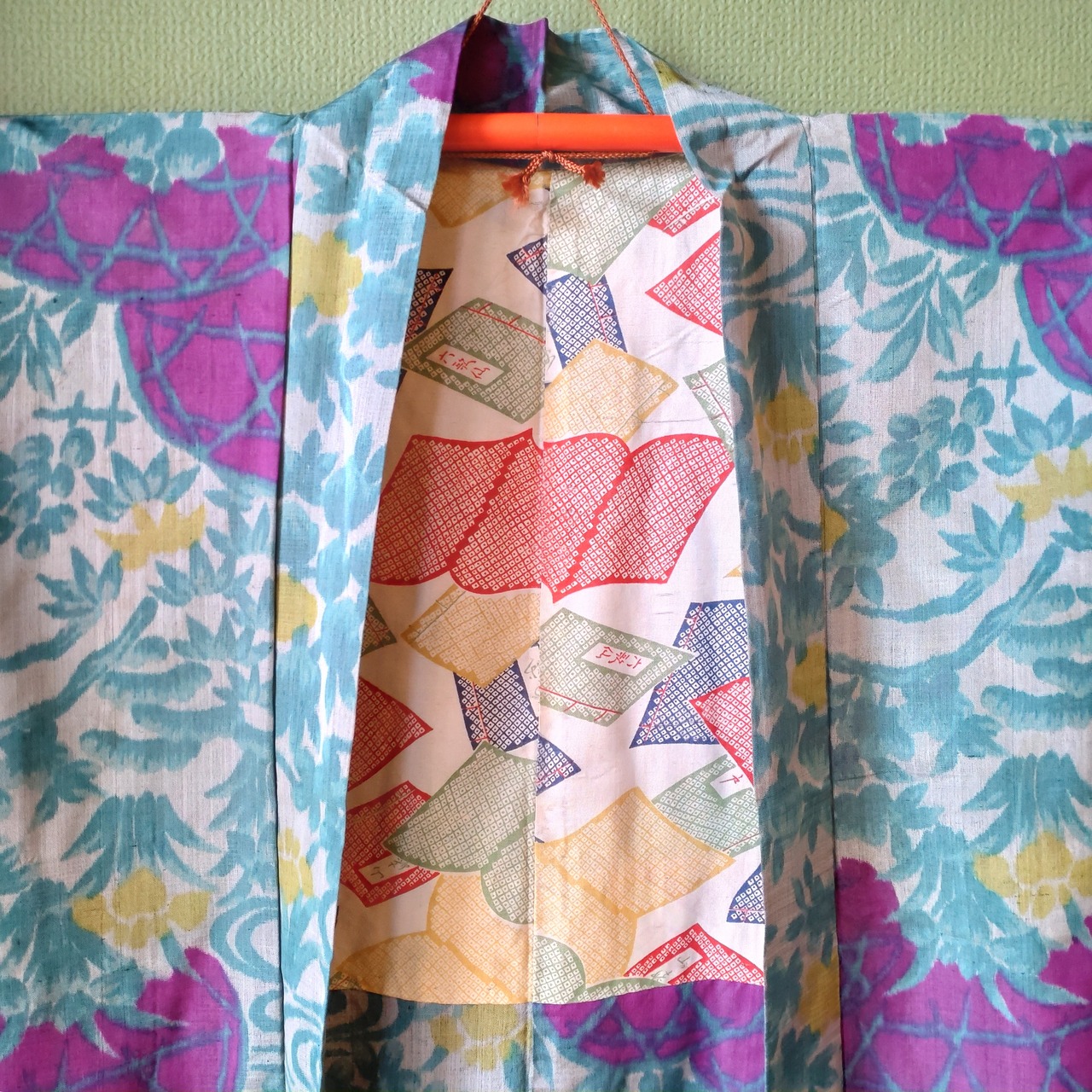 アンティークの銘仙羽織です。ターコイズブルーと赤紫が目を引くカラーリング。羽織紐が太めの黒×ビビットなピンクなのもクールです。羽裏は歌集など本が沢山。色々な所にフックがある1枚です。