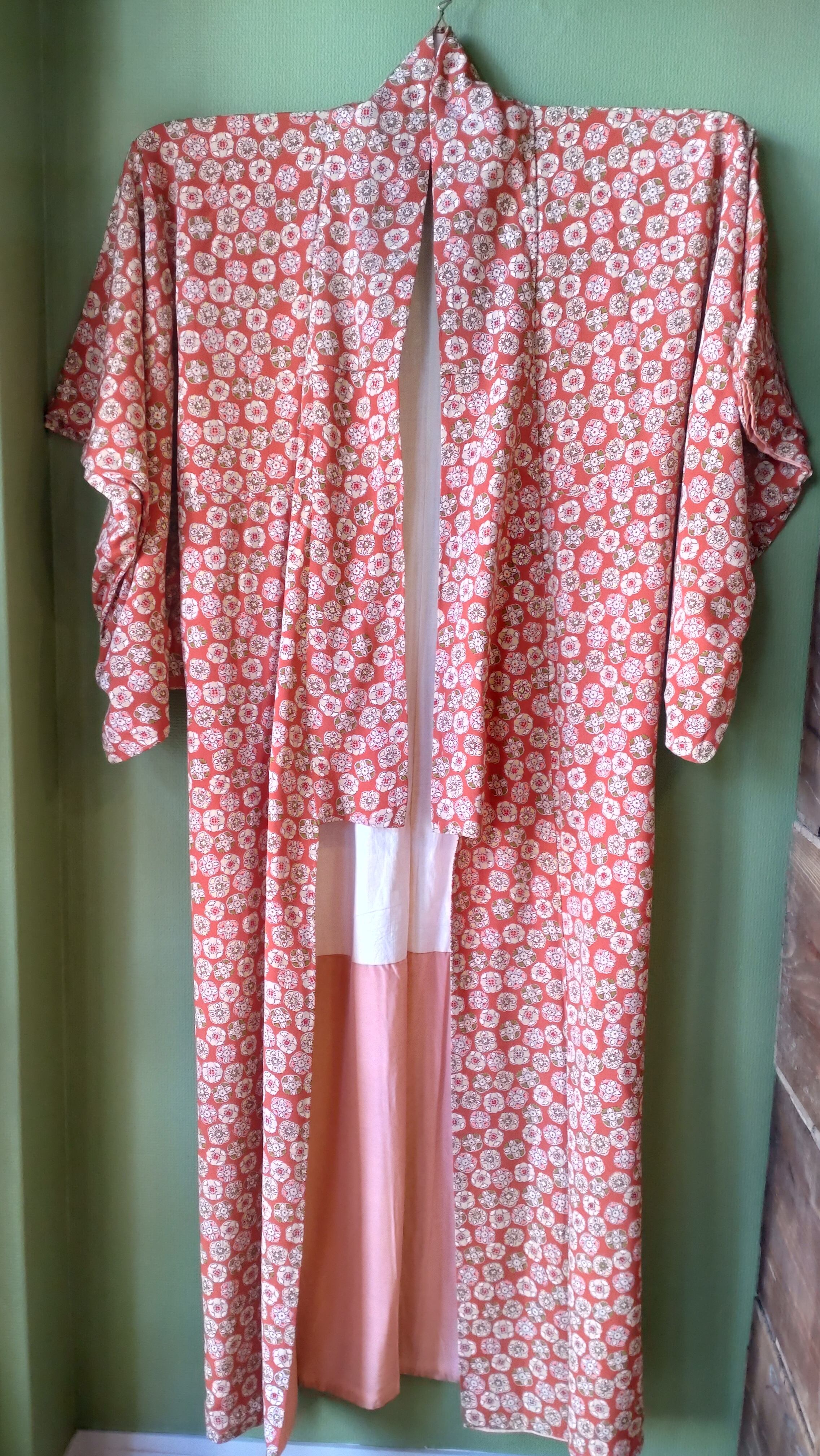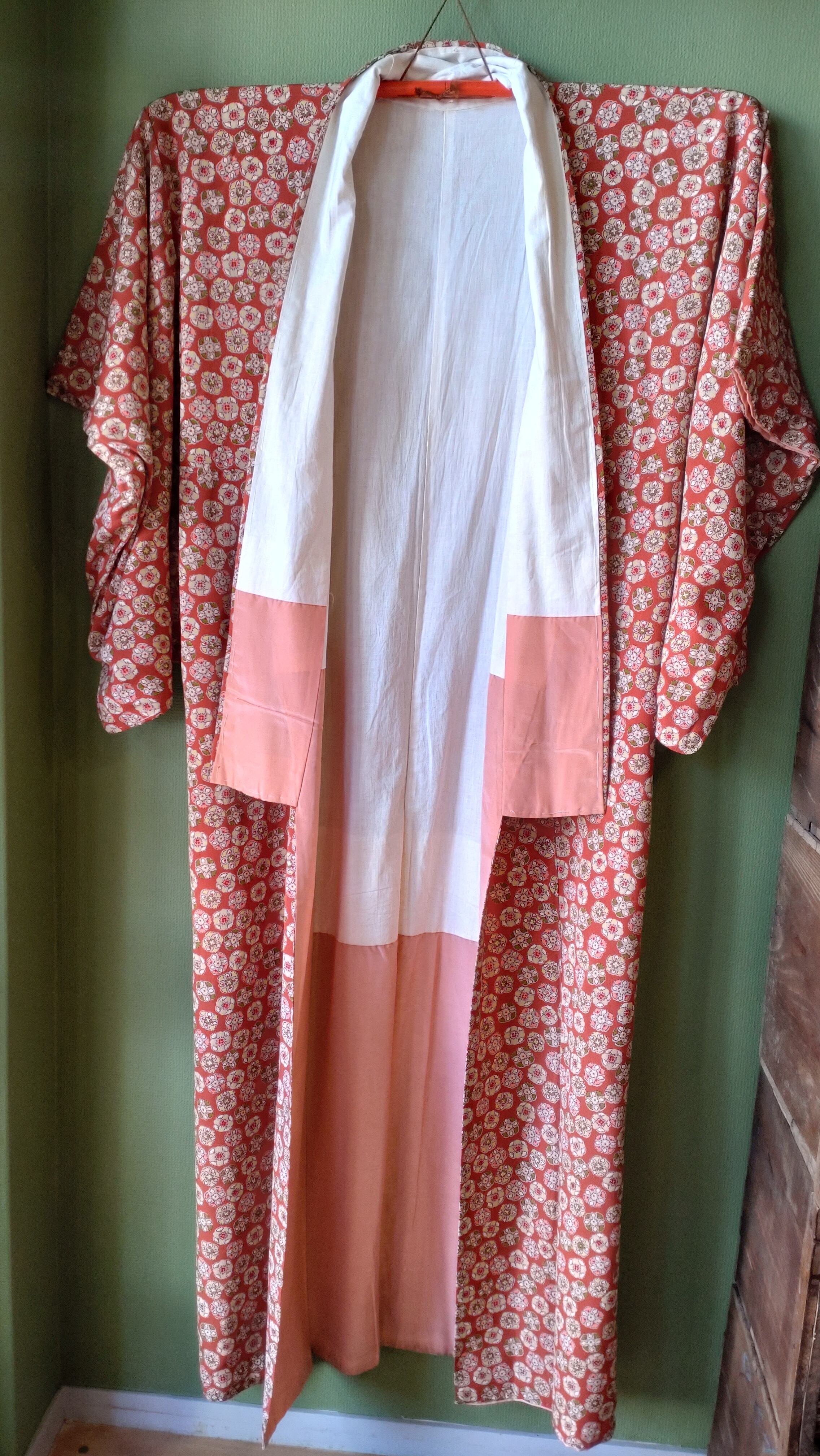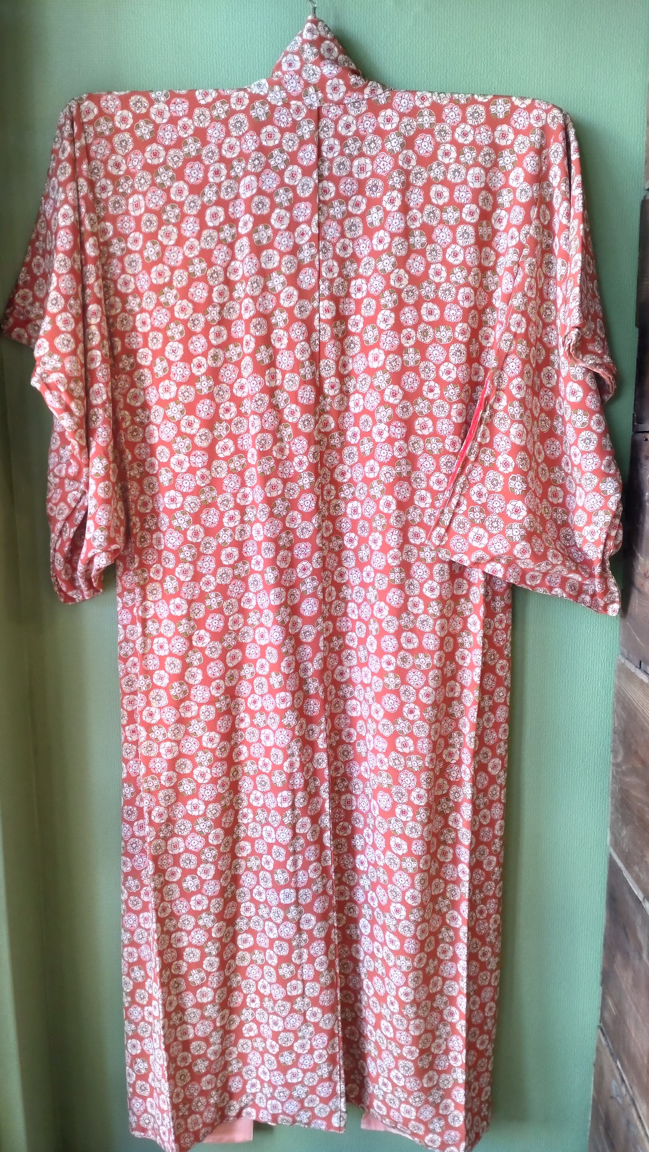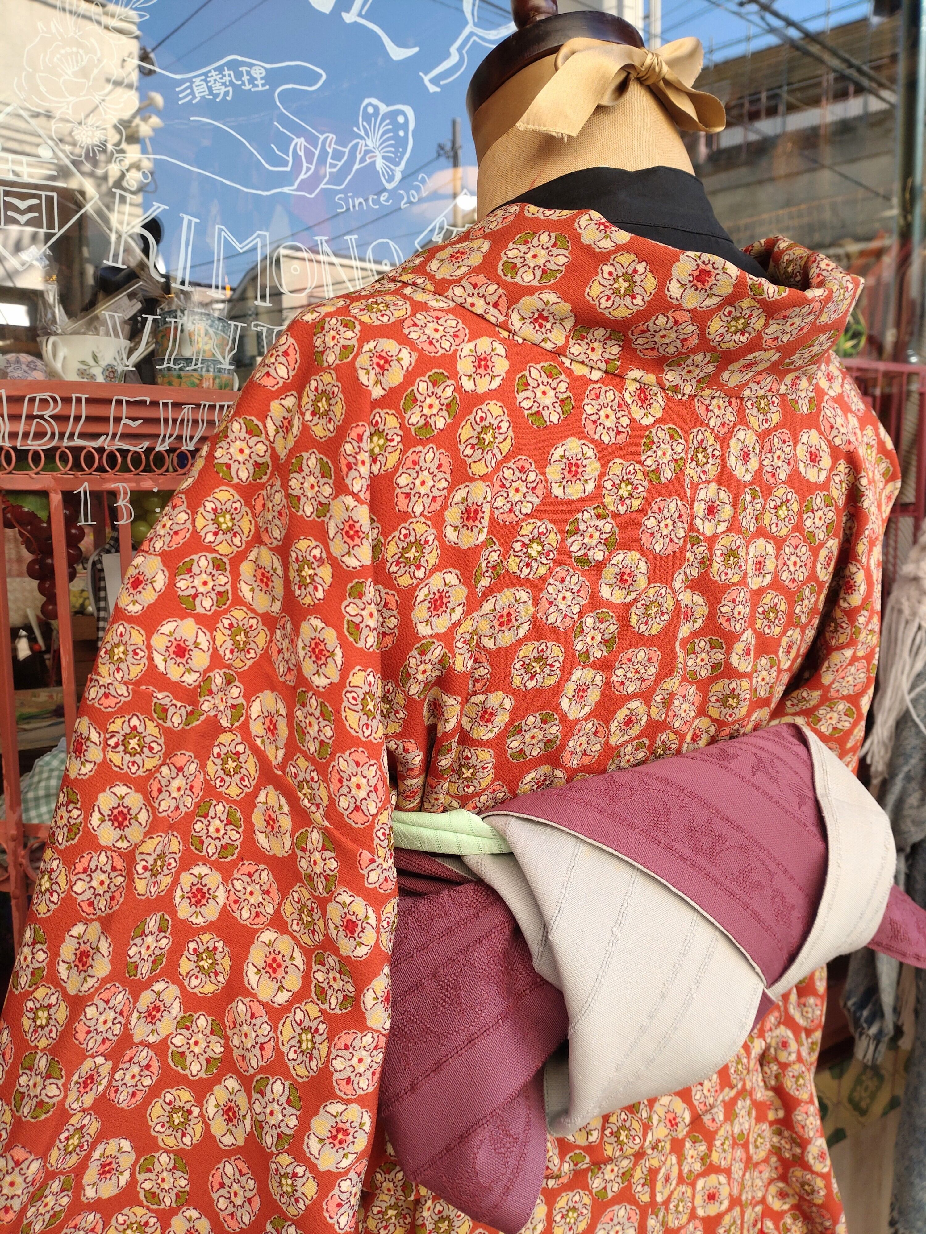 アンティークの小紋袷着物です。マイルドなレンガ色にさくら餅のようなカラーリングのお花が可愛らしい一枚です。
