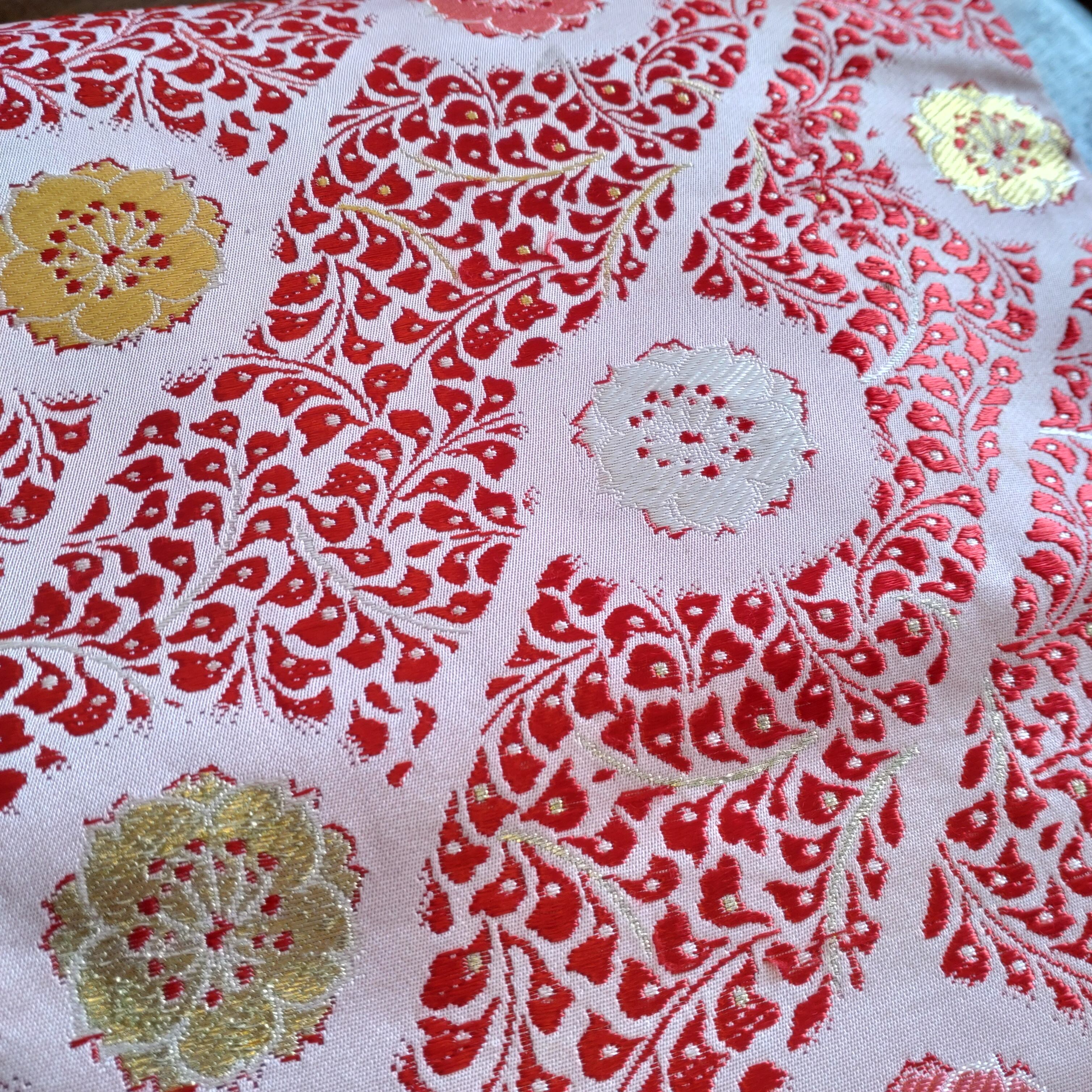 八重桜文様の名古屋帯です。ごく薄いピンク色にボワッと光るような八重桜と赤い葉の模様が品のある可愛さです。