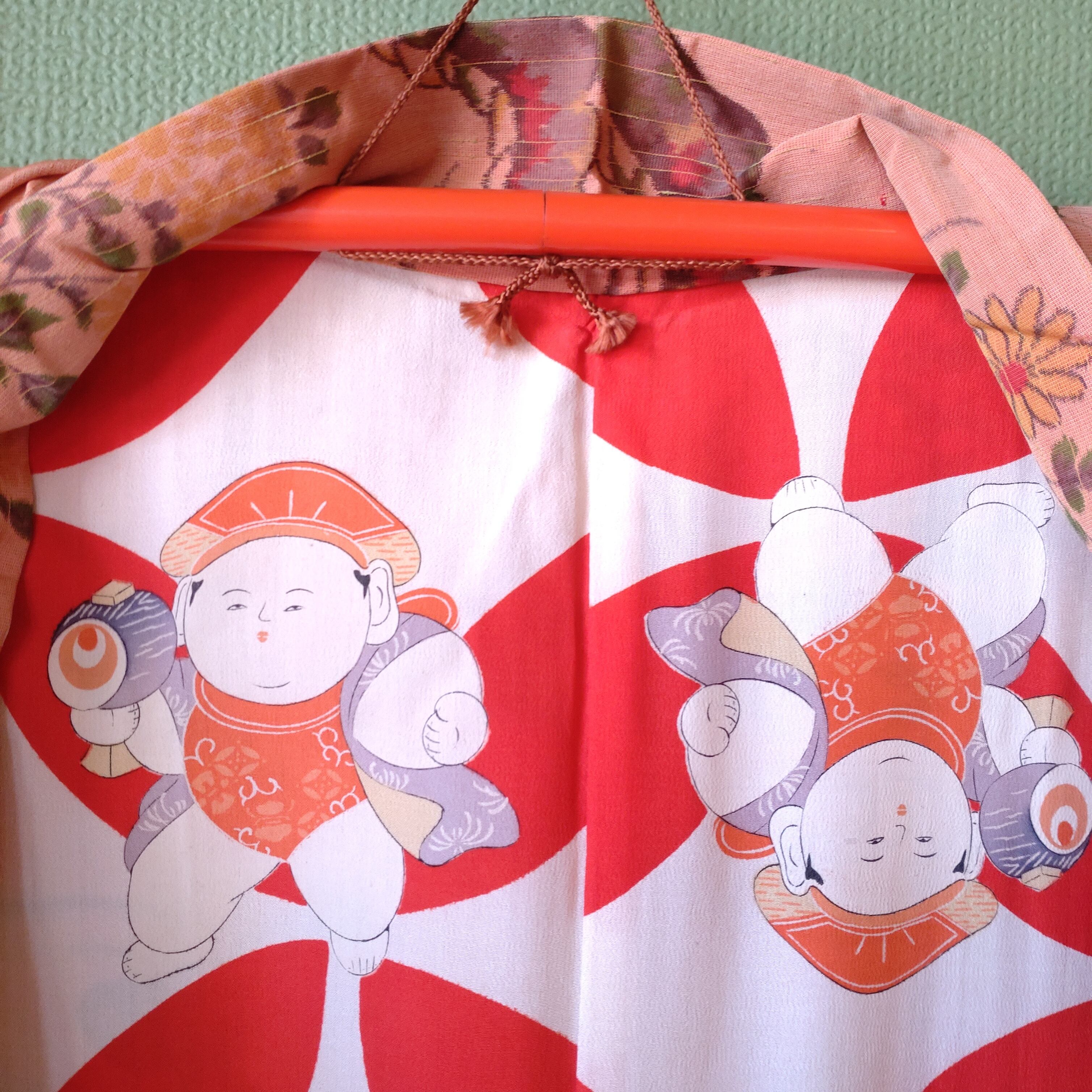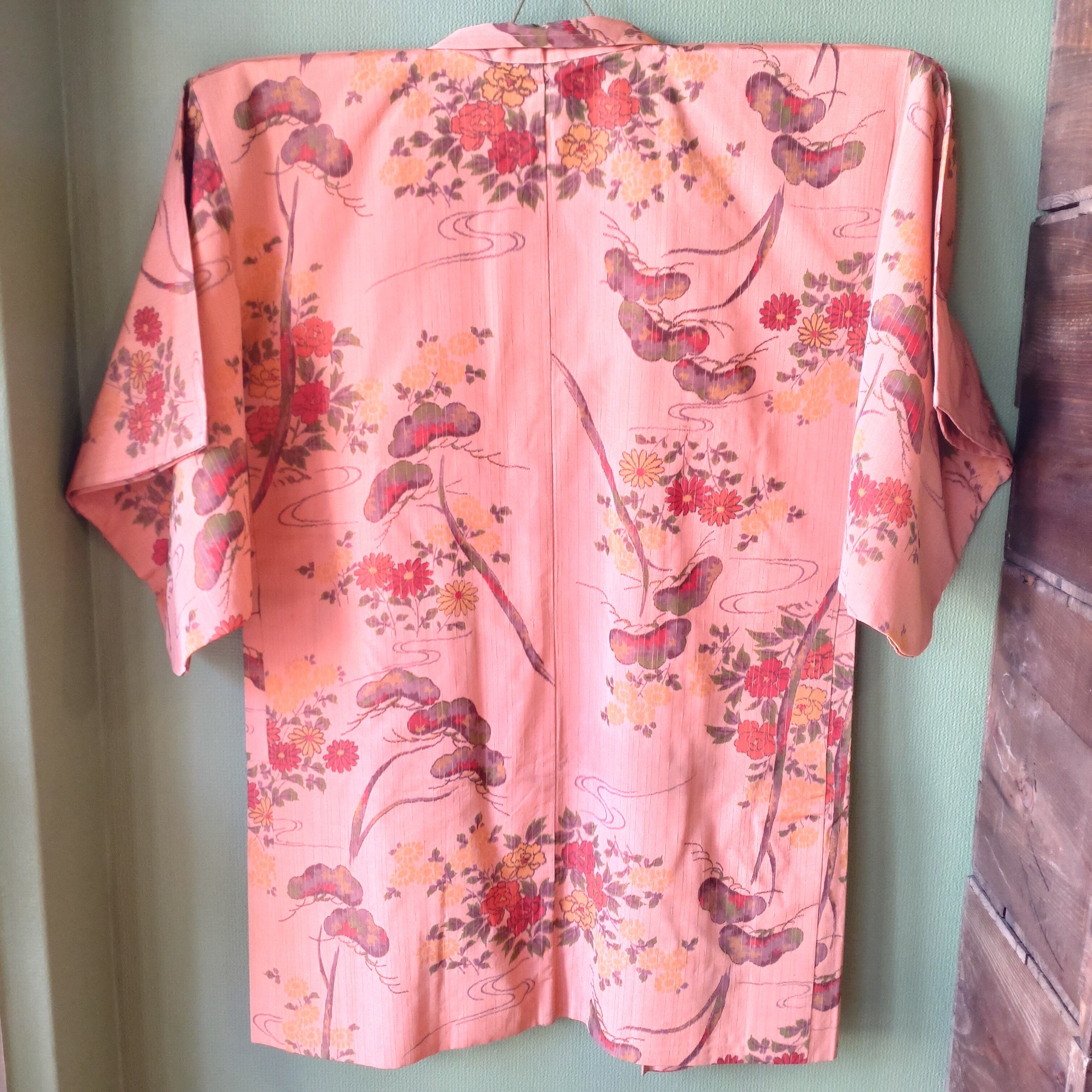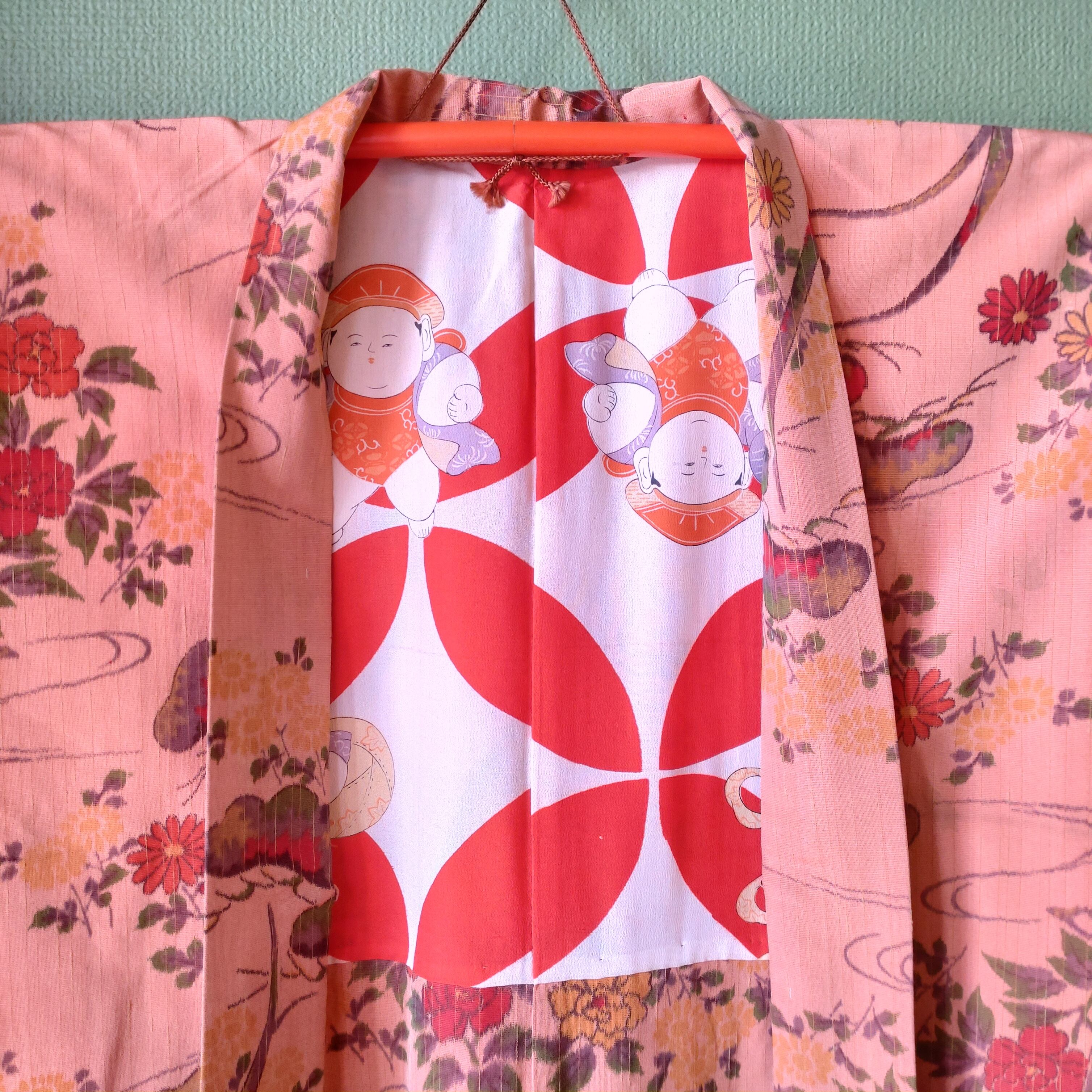 銘仙羽織です。コーラルピンクに松や牡丹の柄が繊細に描かれています。羽裏にはむちむちキュートな恵比寿様や弁財天が!