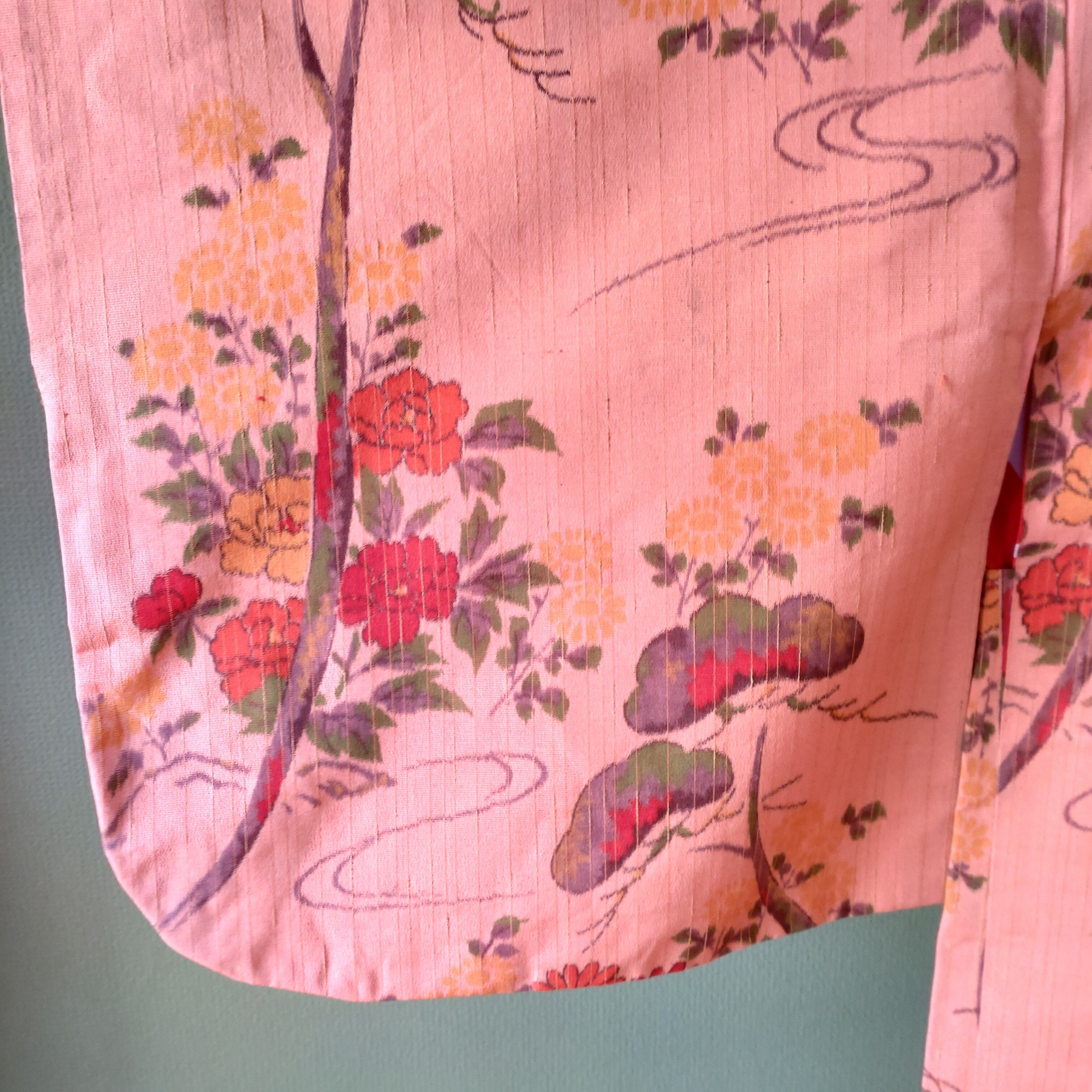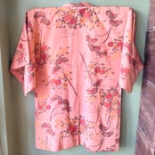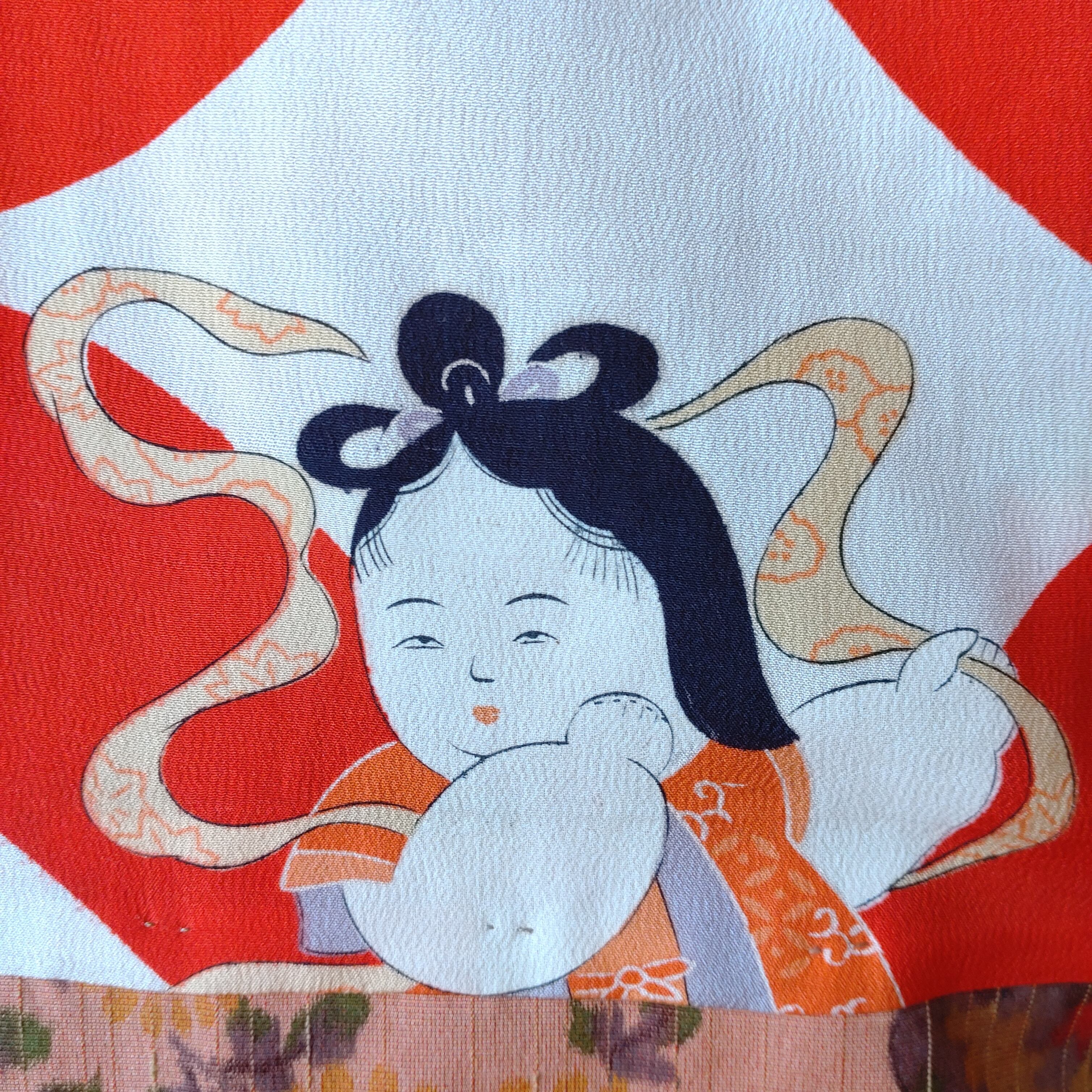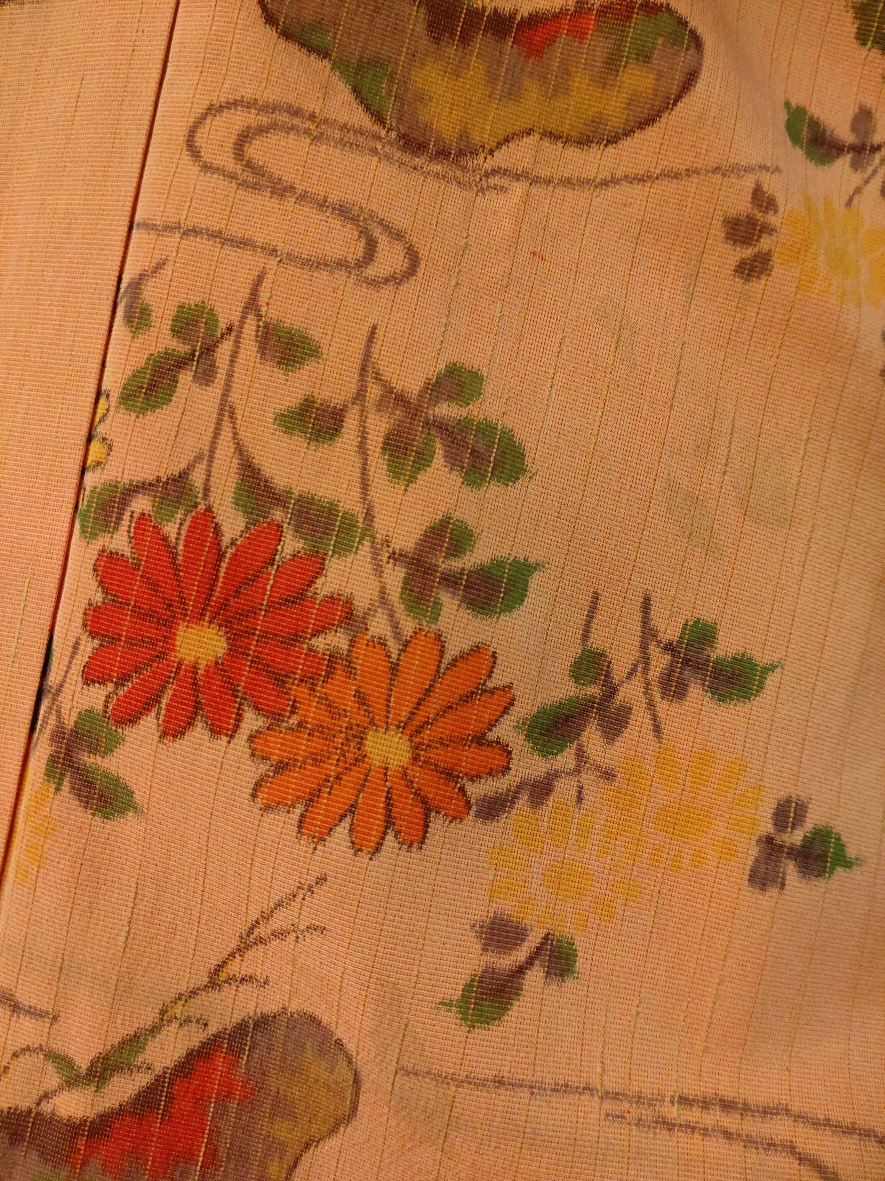 銘仙羽織です。コーラルピンクに松や牡丹の柄が繊細に描かれています。羽裏にはむちむちキュートな恵比寿様や弁財天が!