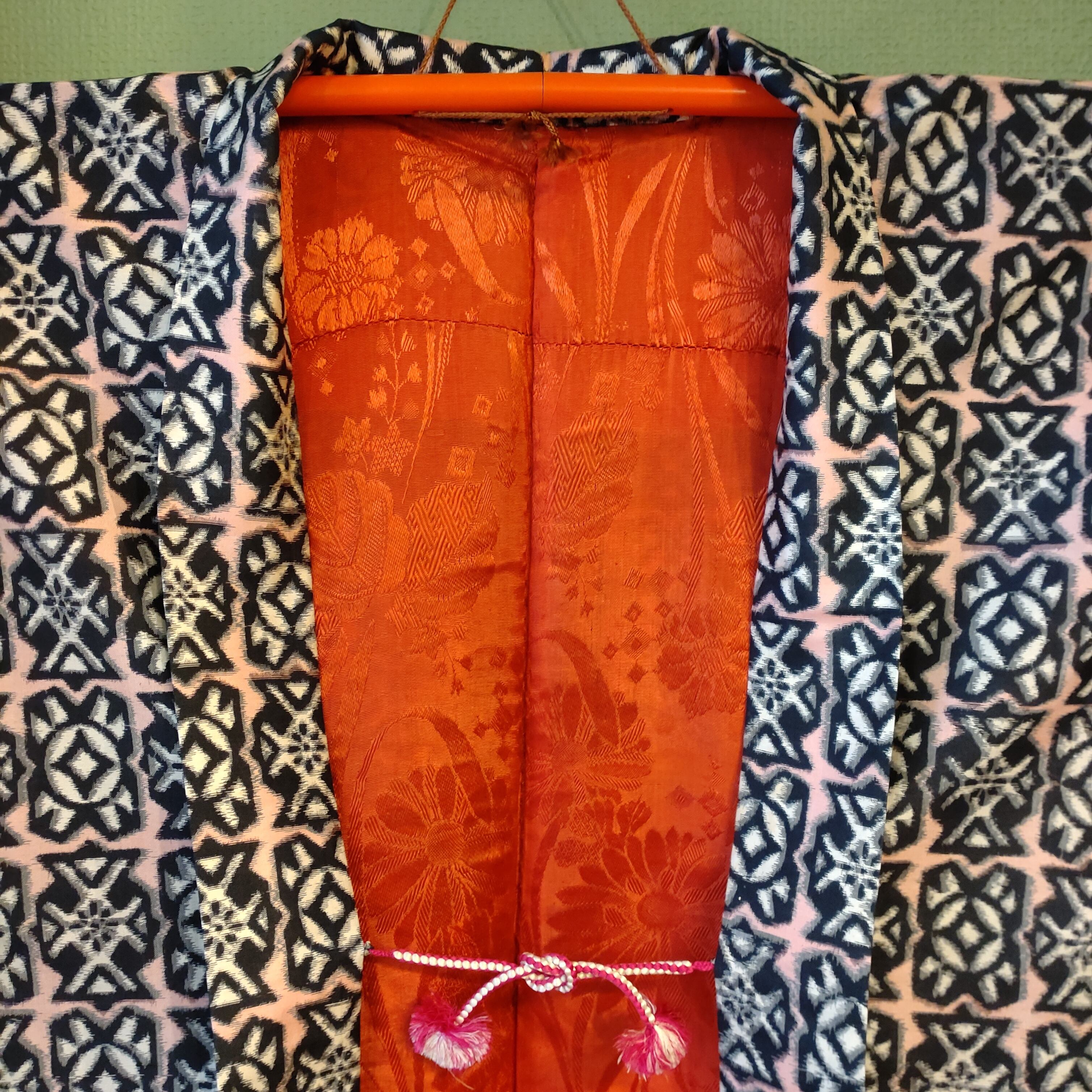 黒ピンクの銘仙羽織です。ビビッドピンクと白の羽織紐もポイント。