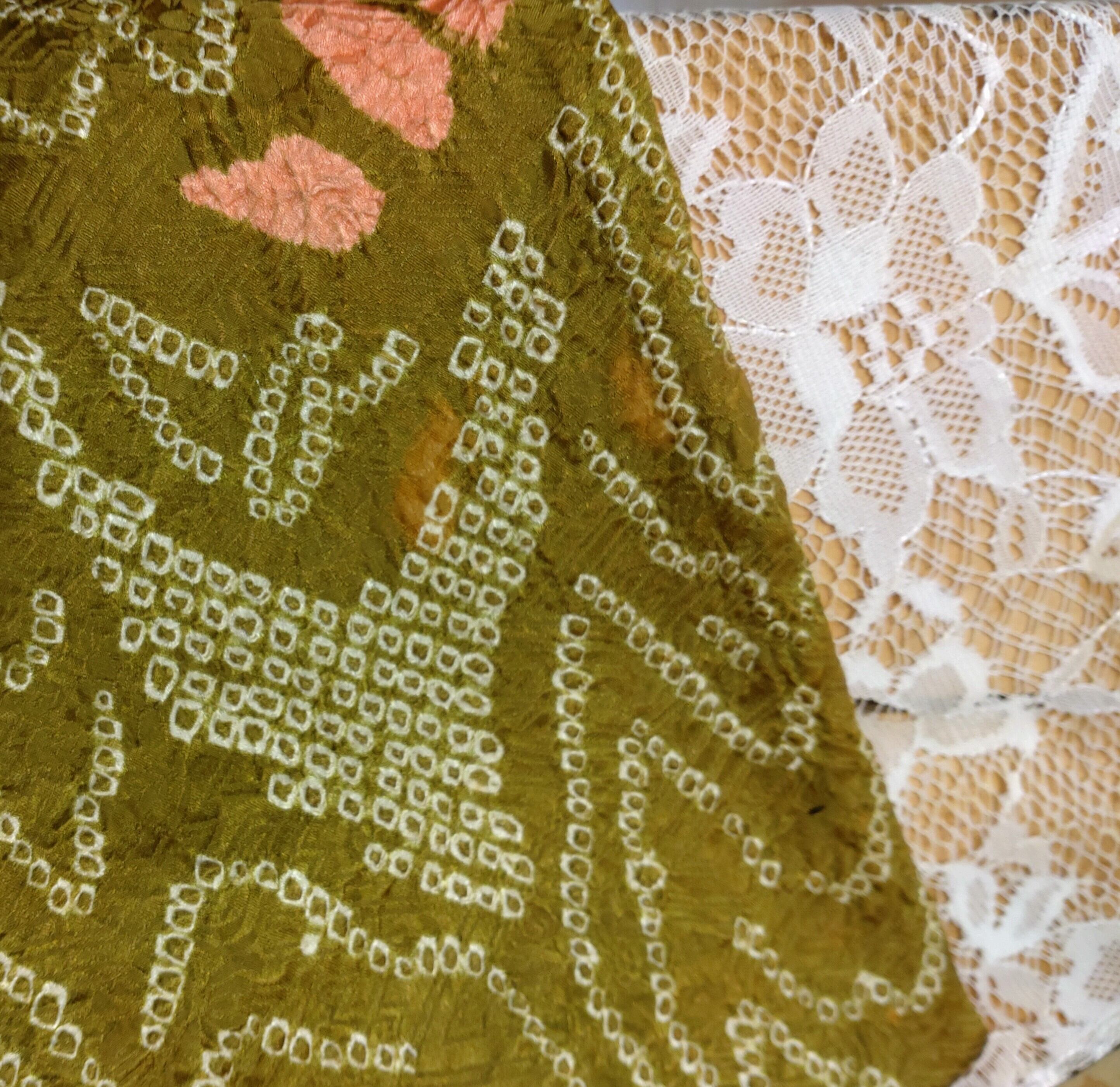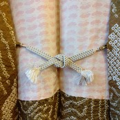 オリーブグリーンにピンク色が渋かわいい、しぼりの羽織です。木目のような柄の中にお花があるのもちょっと個性的。