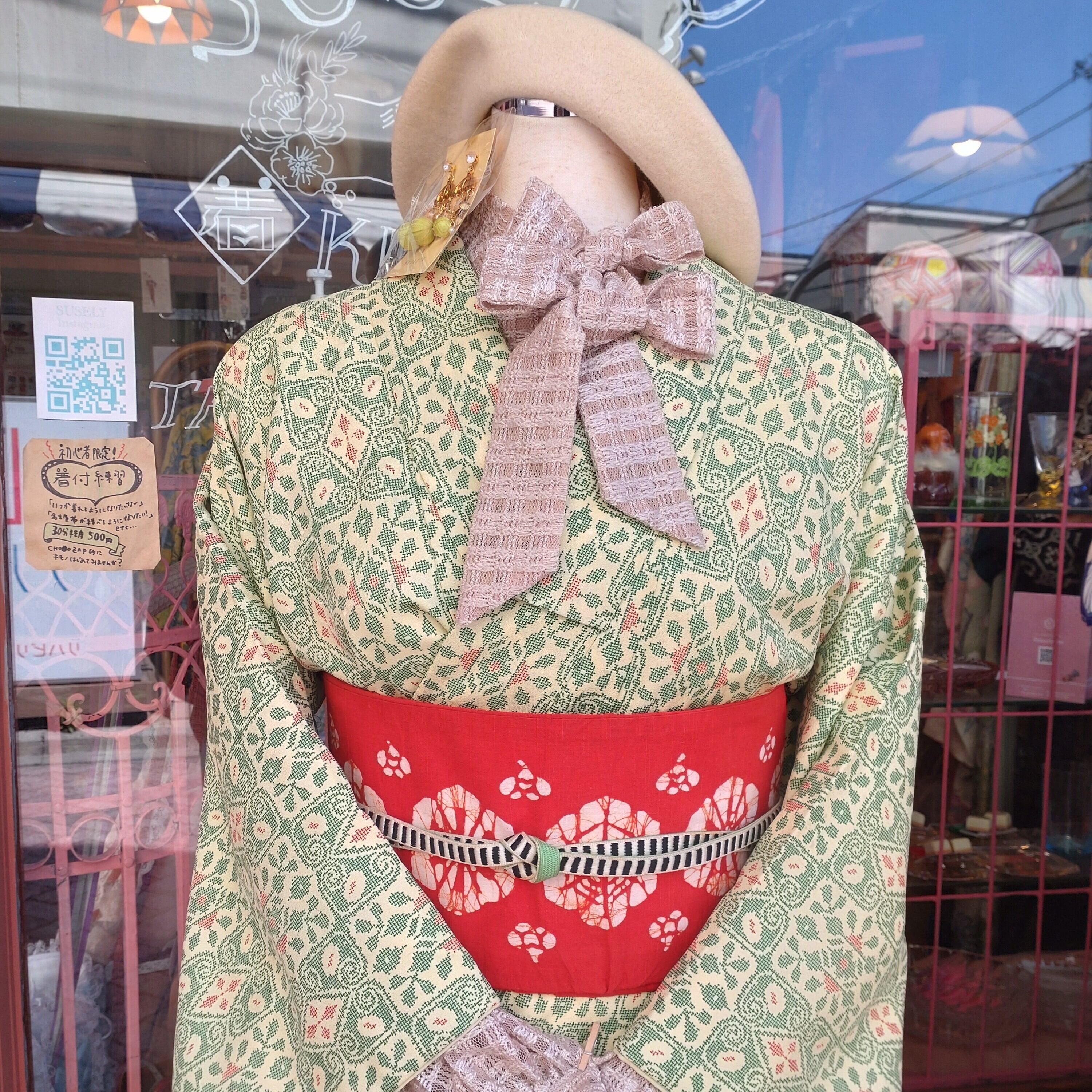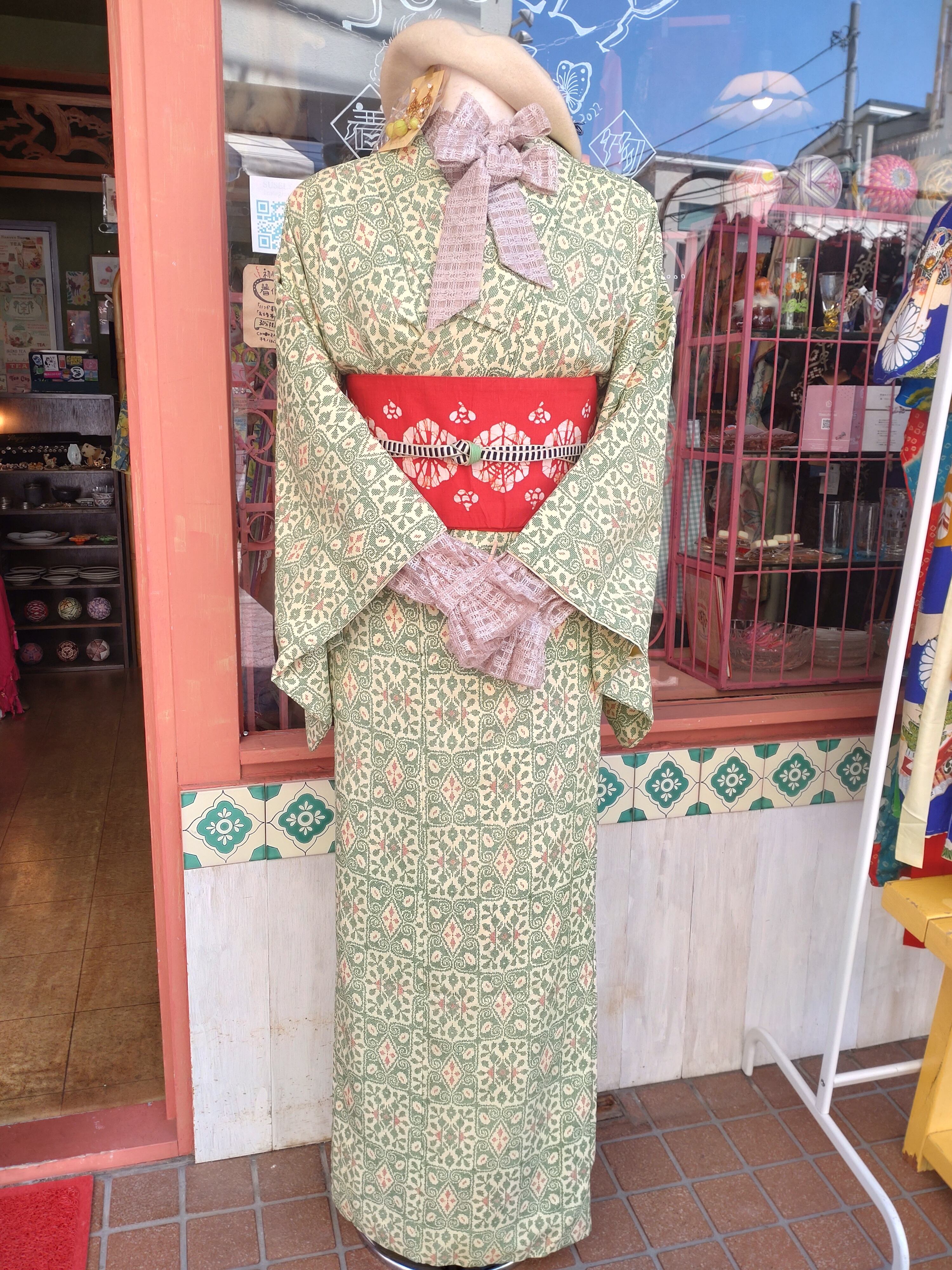 生成に緑と赤のトランプのような模様がかわいいポリエステル着物です。洗濯済み。