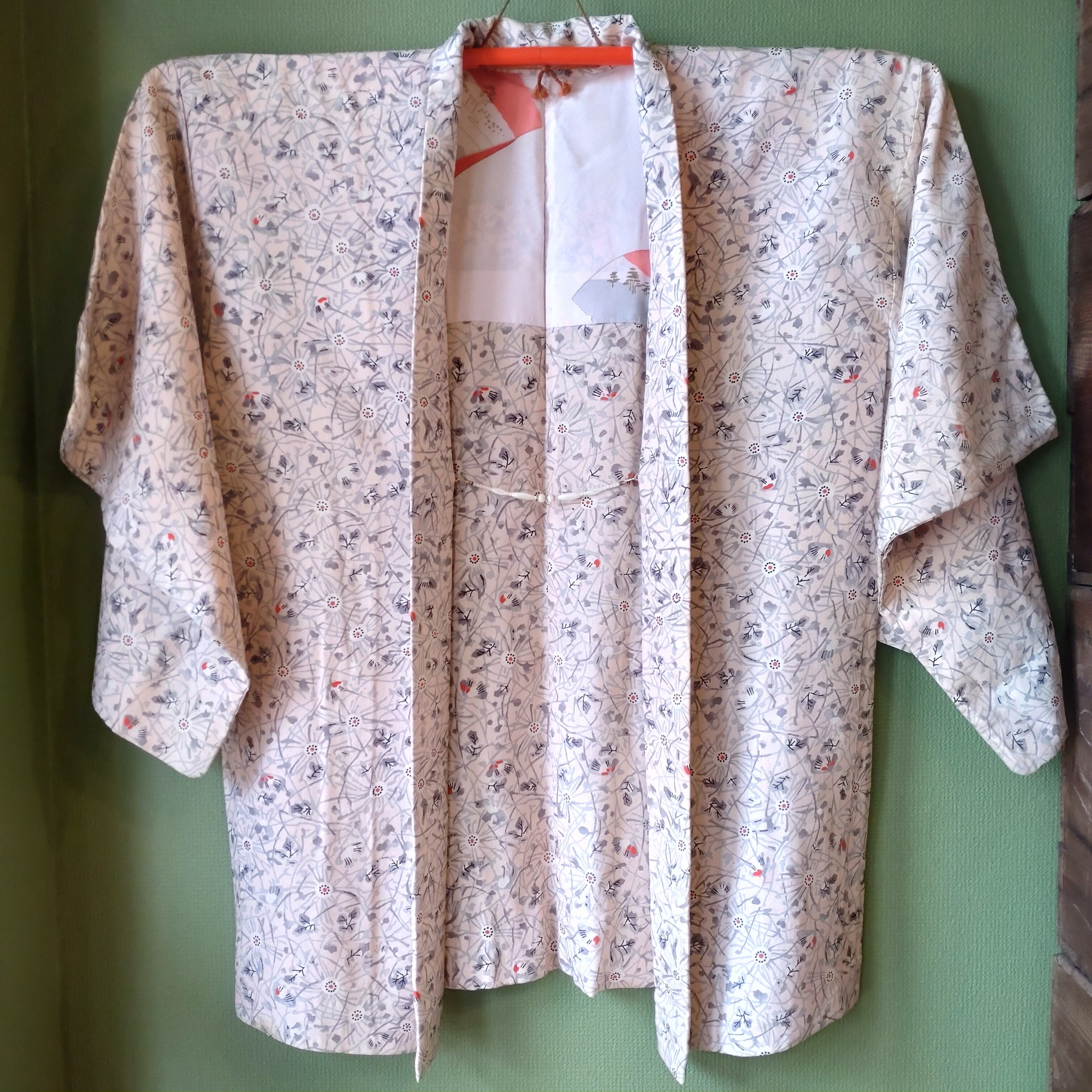 ごく薄いピンクがかった乳白色に、グレーの綿毛のようなお花柄の羽織です。上品な白いビーズの羽織紐付き。