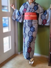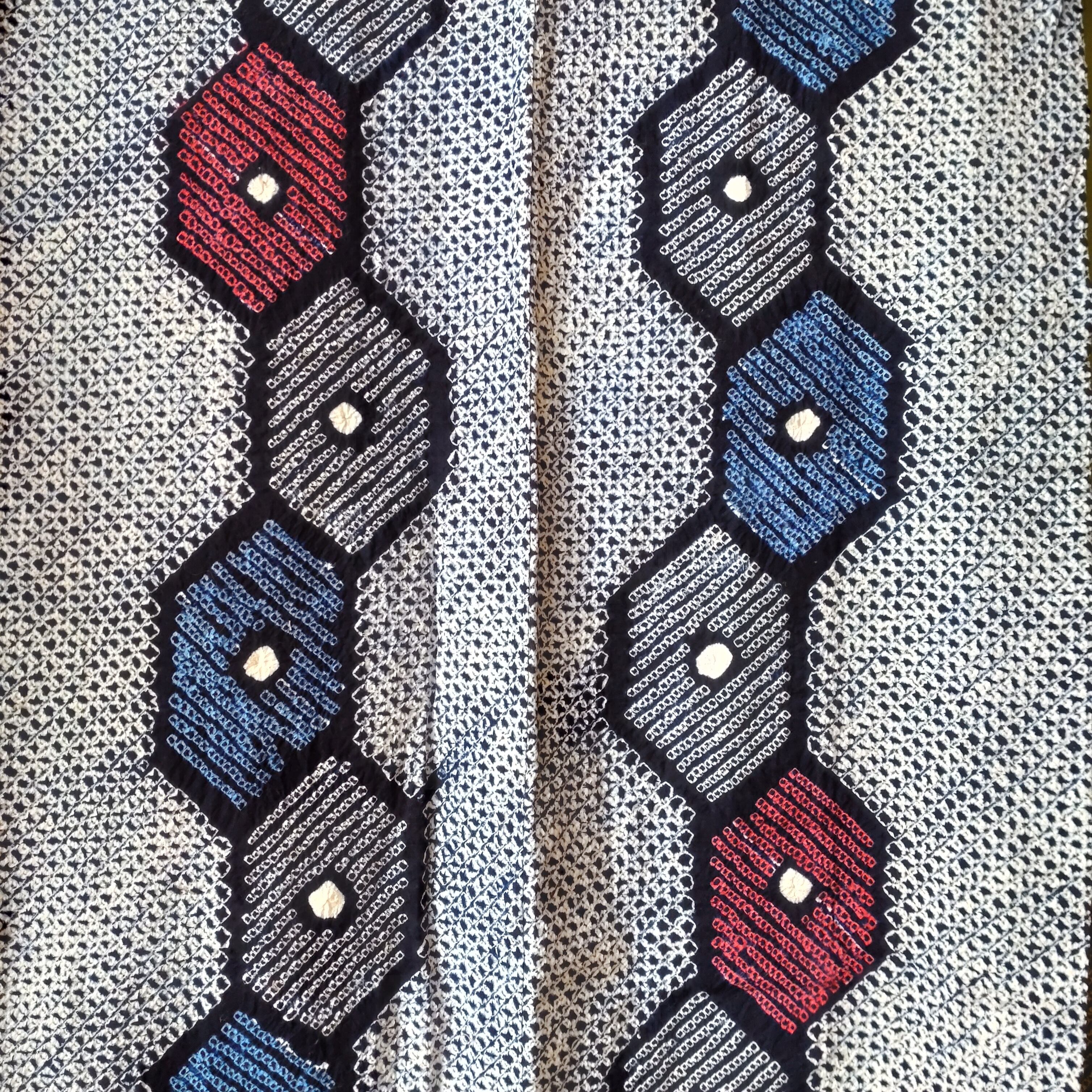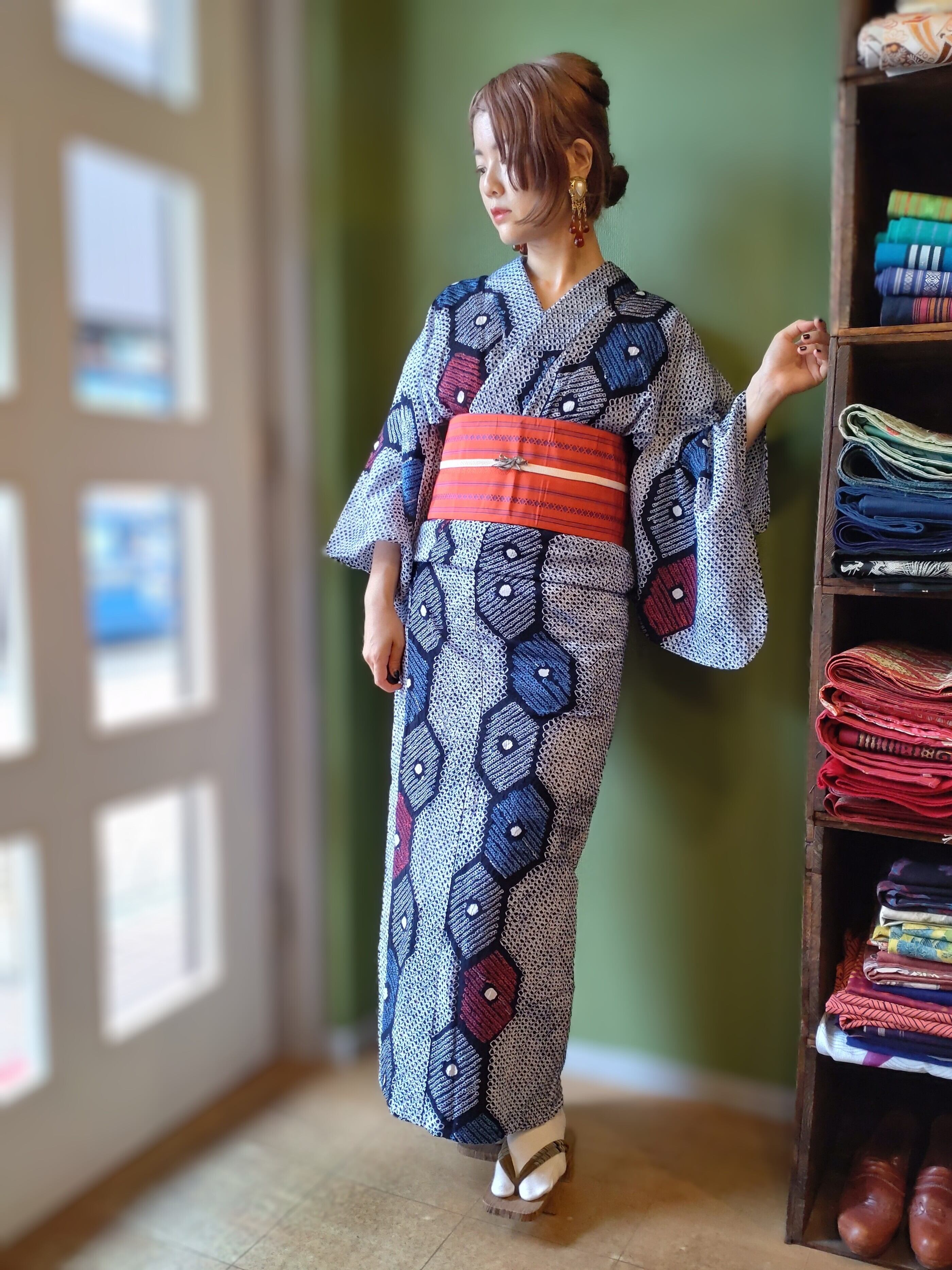 亀甲模様にトリコロールカラーが目を引く、年齢問わず素敵に着ていただけるデザインです。
