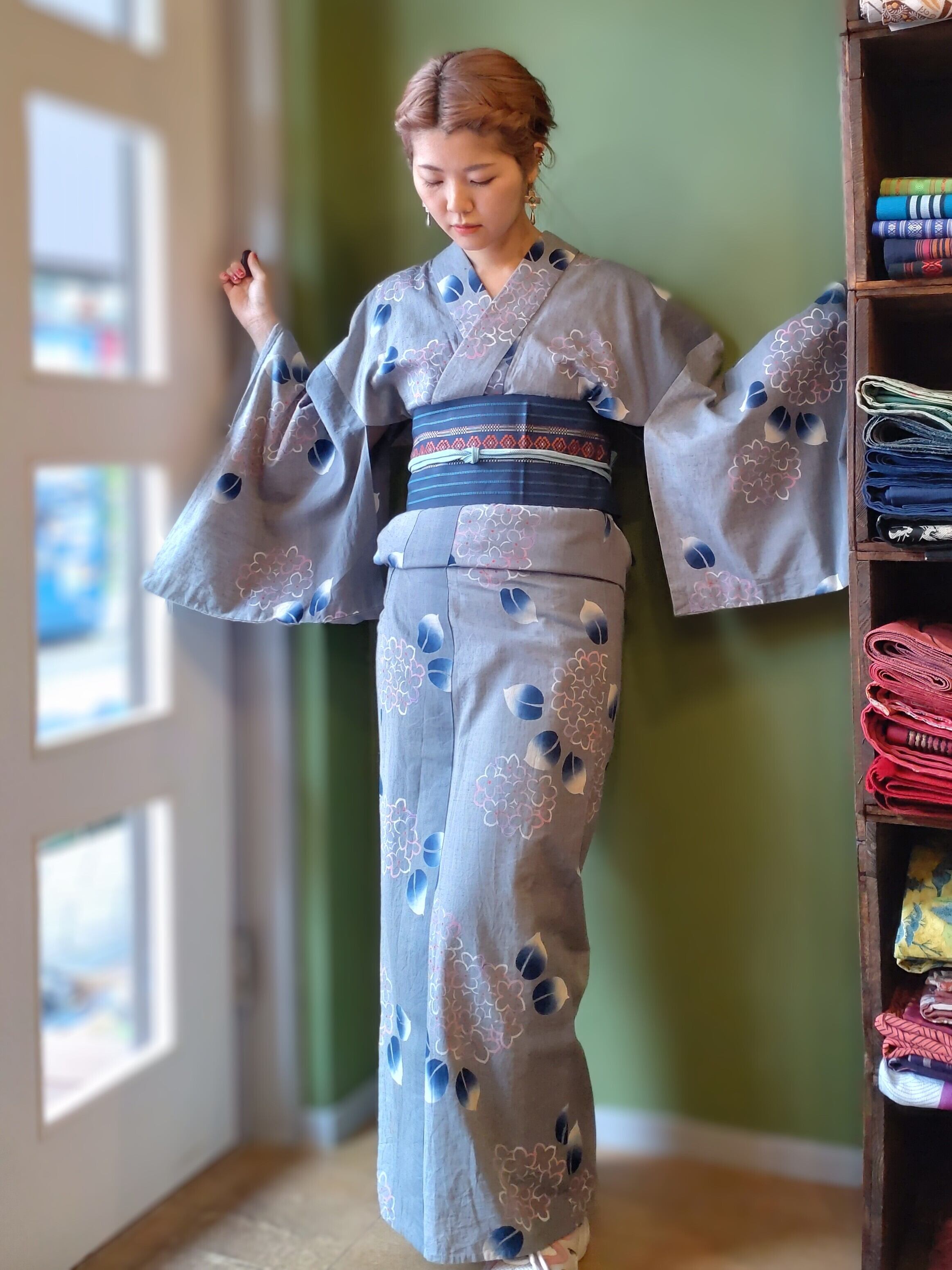 落ち着いたグレーと紫陽花柄が大人かわいいデザインです。グレーの生地はグラデーションになっており、背中心や袖の切り替えで2トーンになっているのも粋。