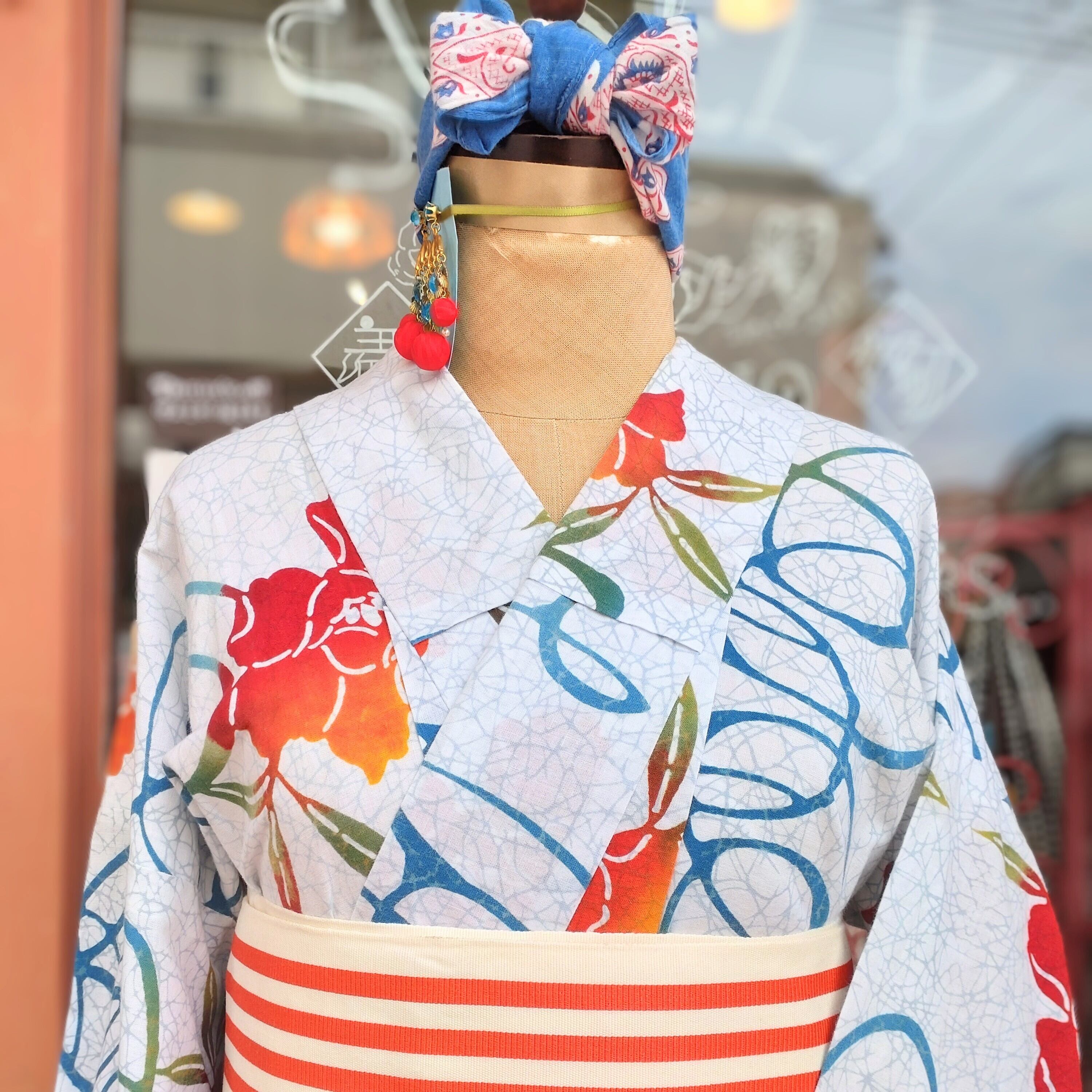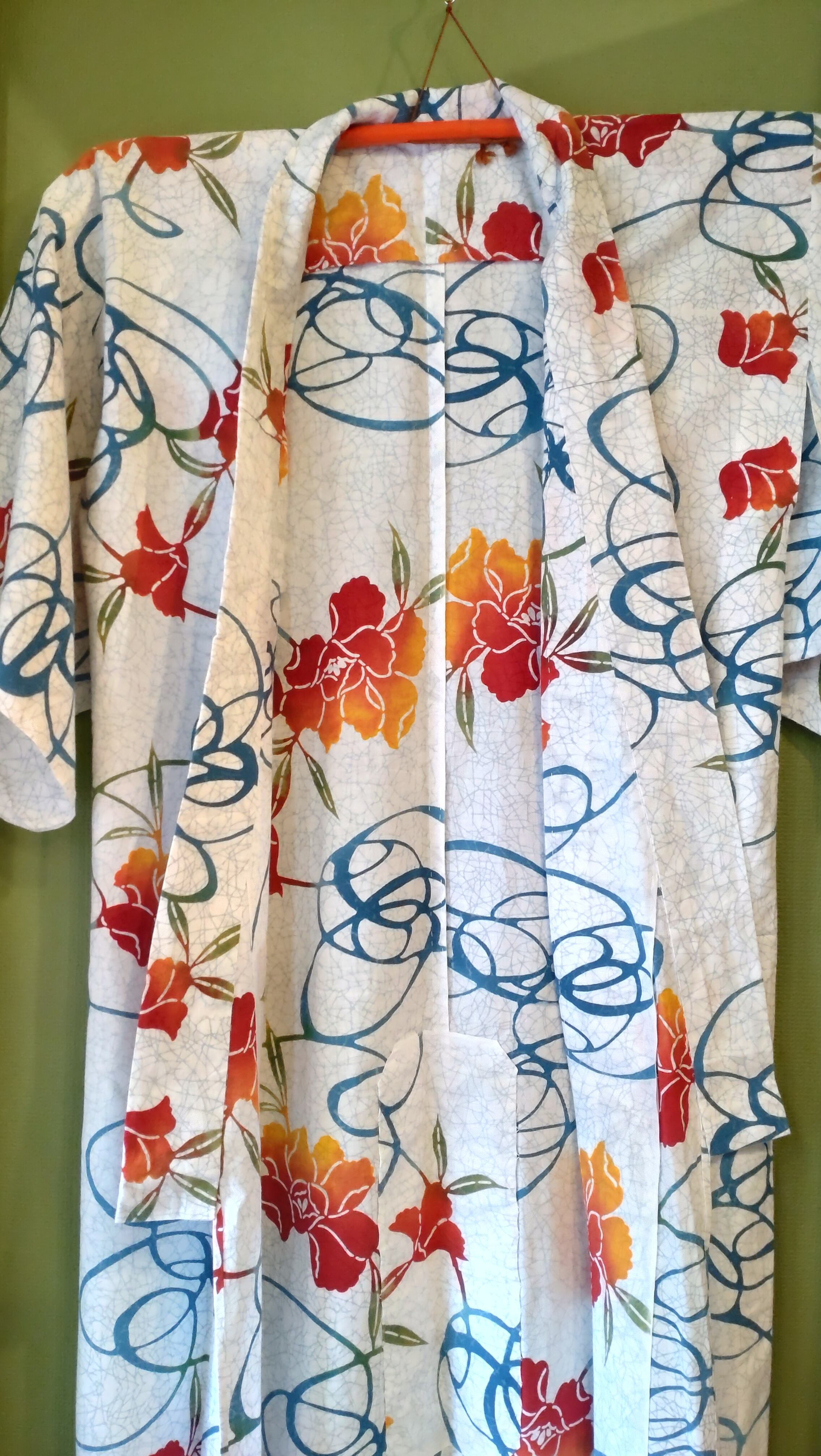 夏らしいカラーリングの爽やかな手縫いの注染浴衣です。花柄なのに水面を楽しく泳ぐ金魚のようにも見えます。洗濯済み。