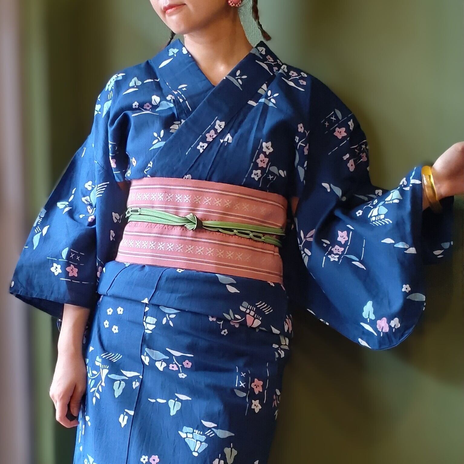 紺地にパステルカラーで描かれた田舎のおうちがなんともメルヘンチックな注染浴衣です。麻が入っておりパリッとした質感です。