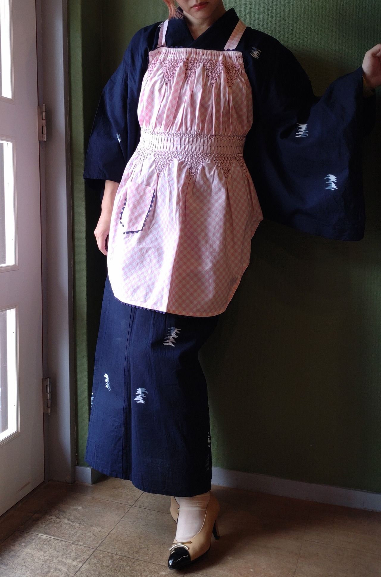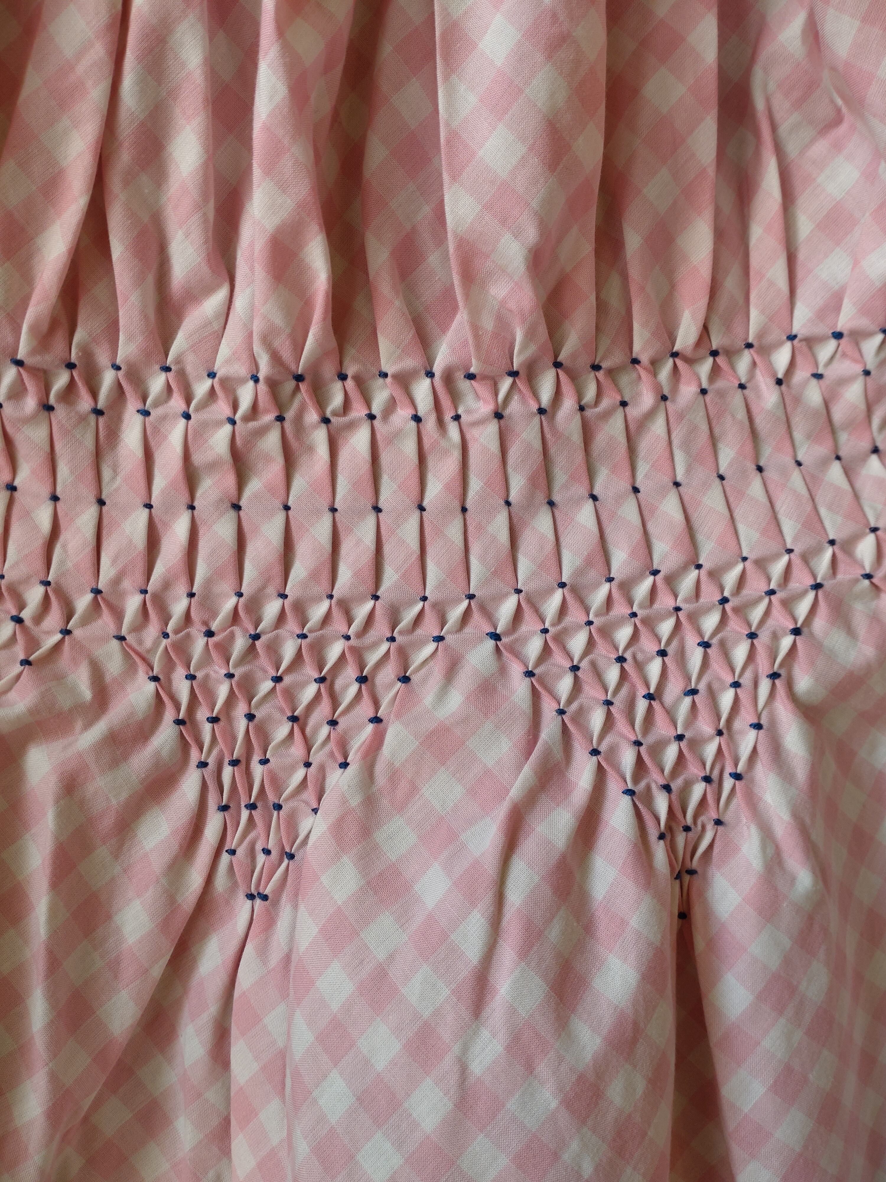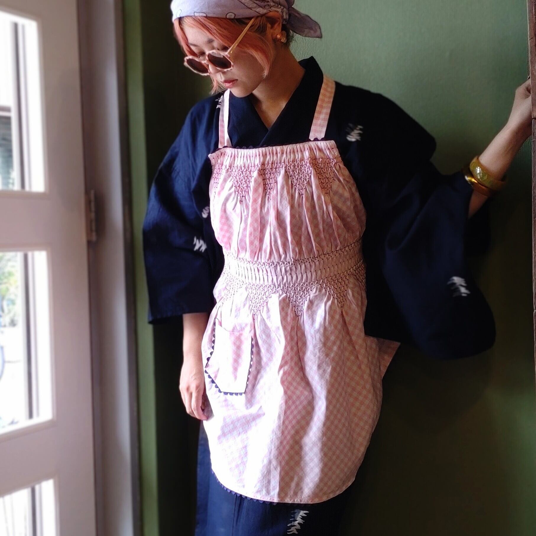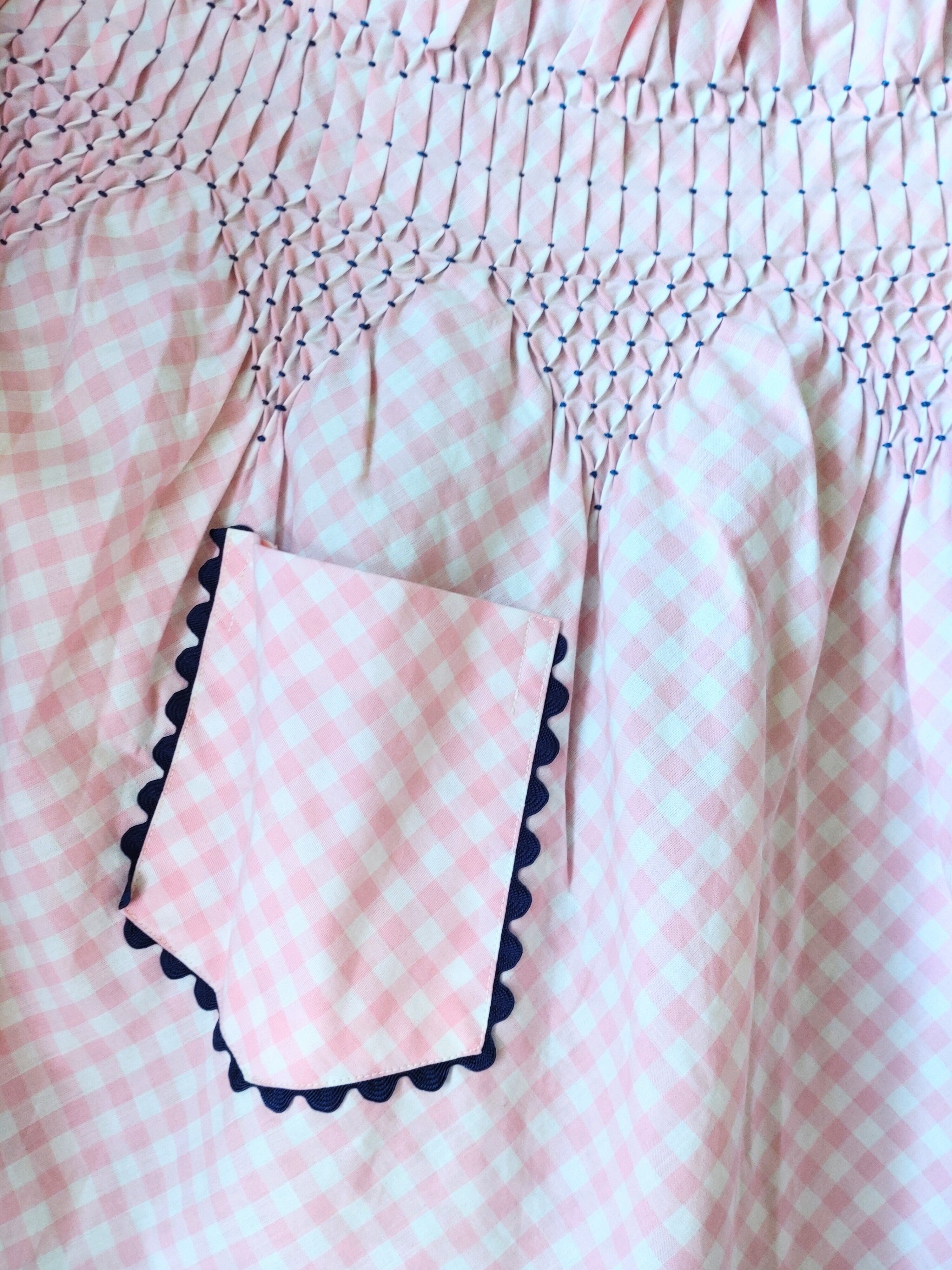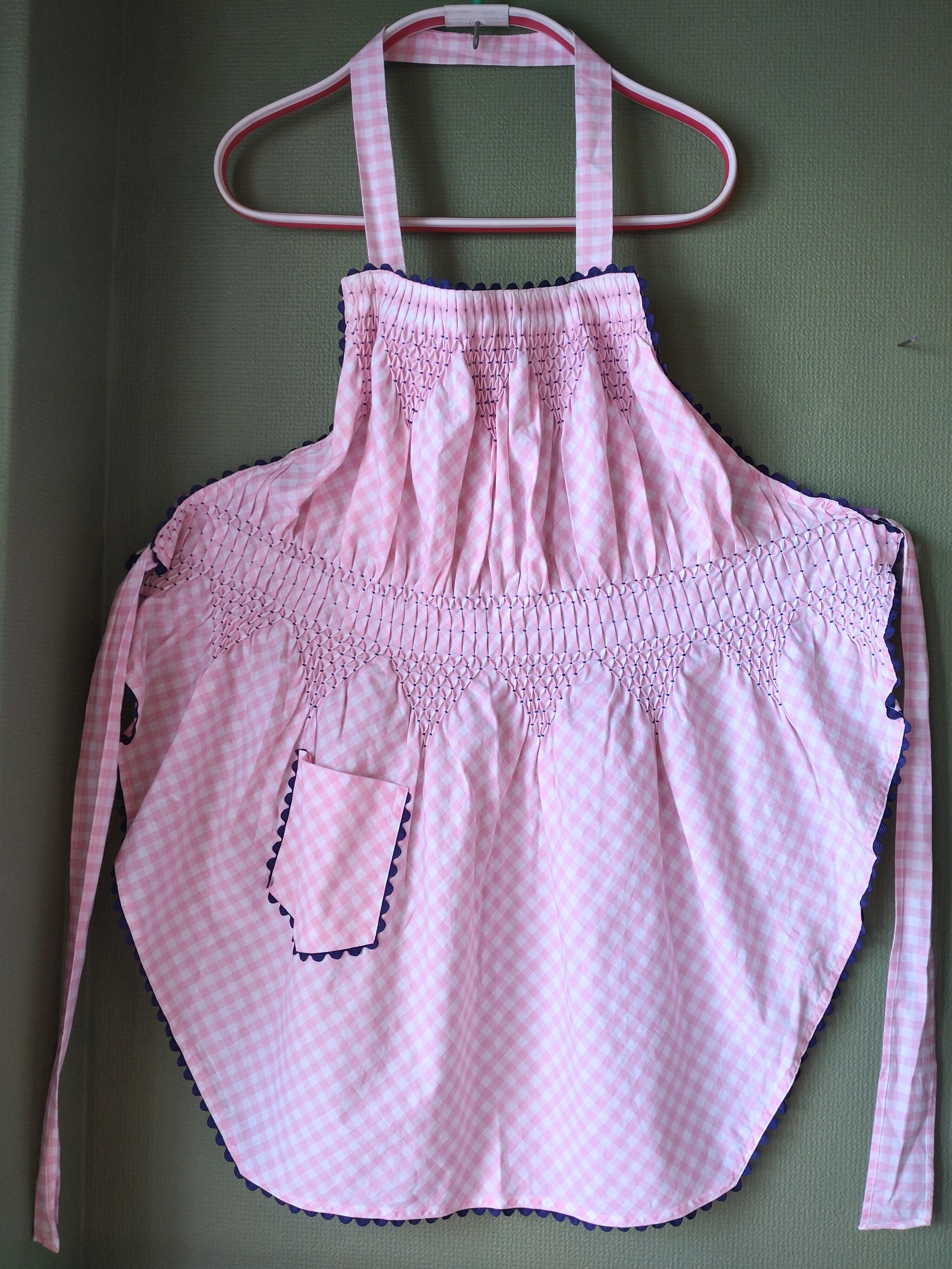 スモッキング刺繍のエプロンです。ギンガムチェックにネイビーのなみテープが可愛さ満点。