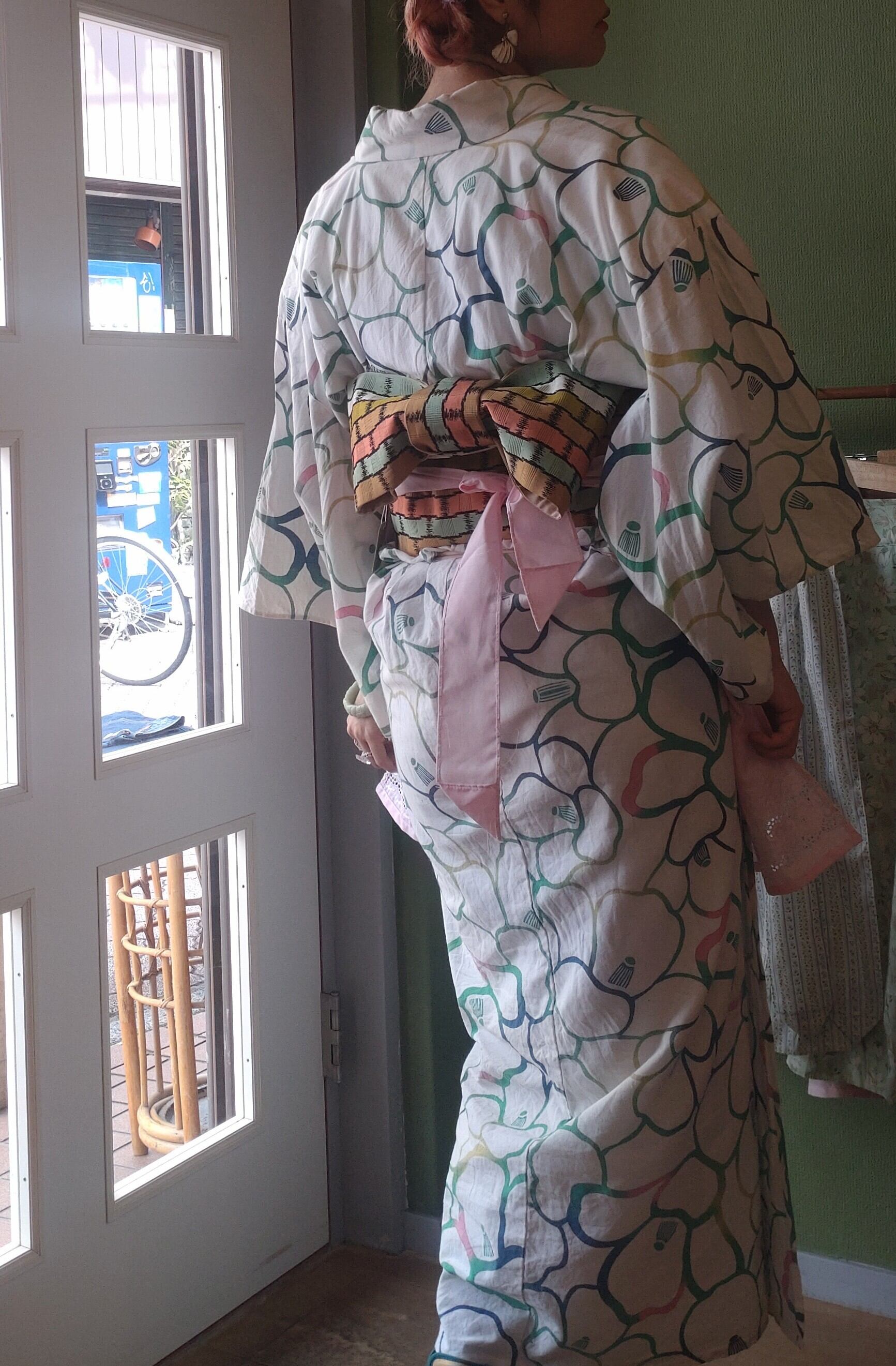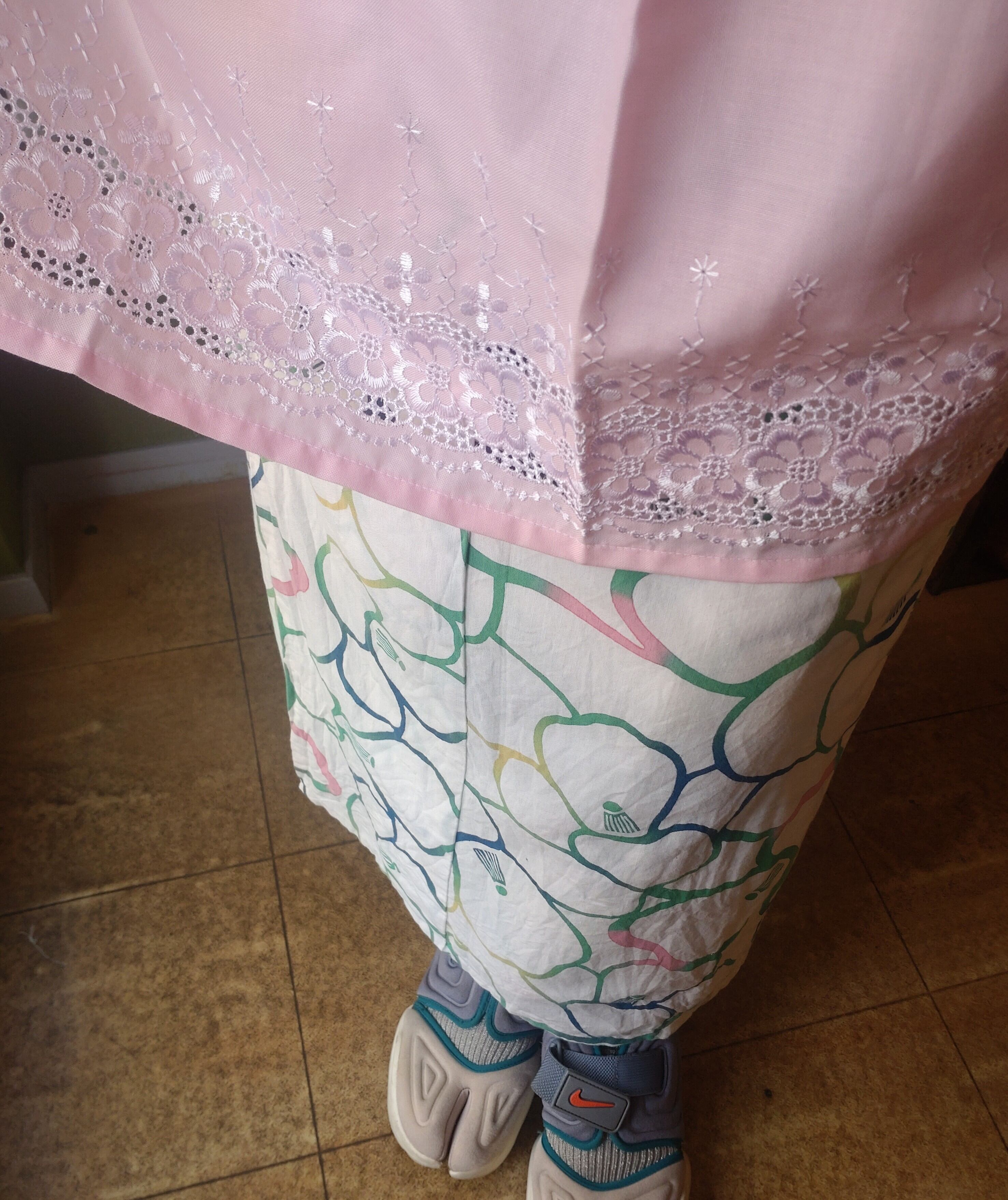 ピンクのサロンエプロンです。短くタイトなシルエットが着物に合わせやすいバランスです。もちろんお洋服にも。