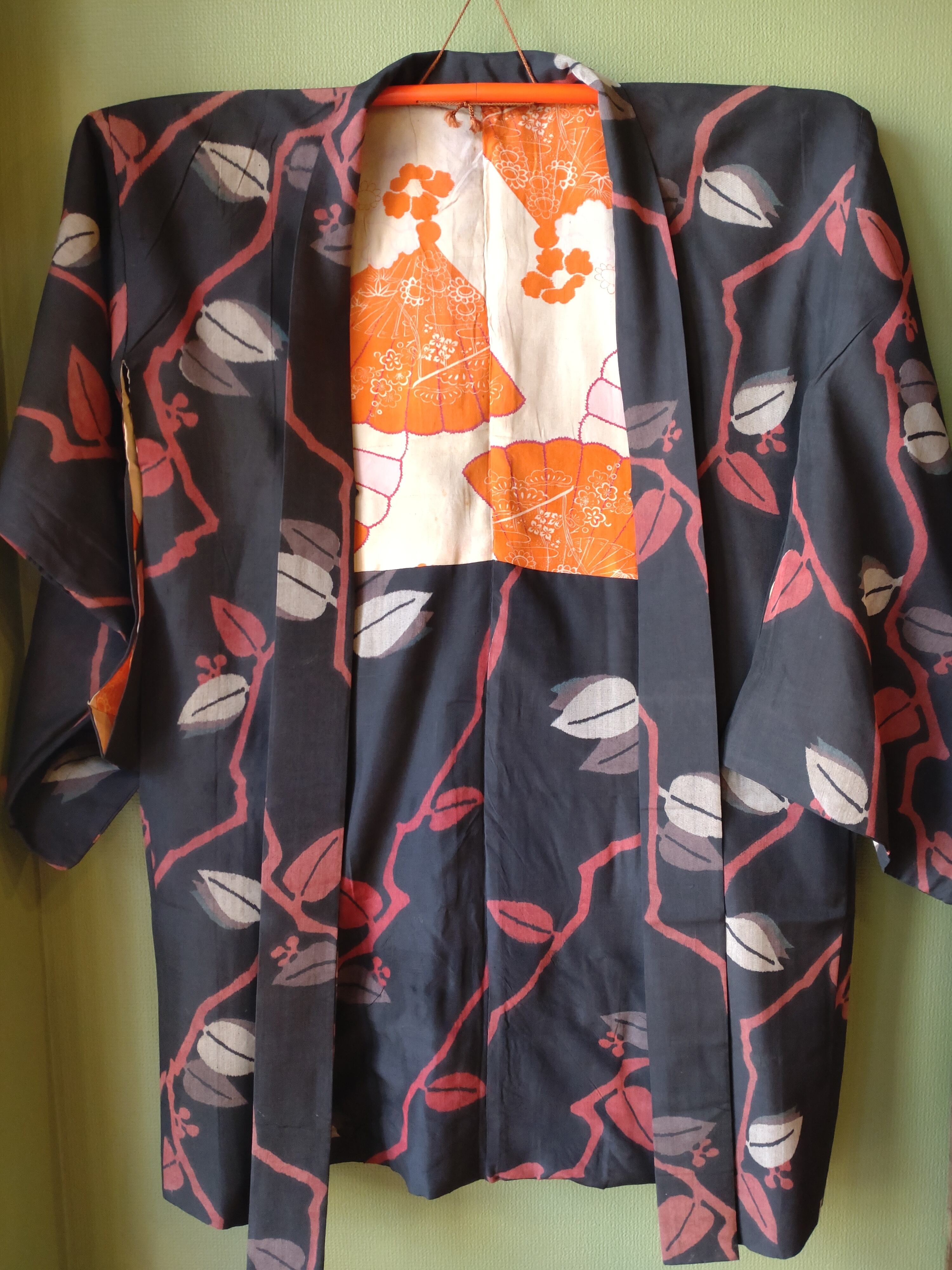 アンティークの銘仙羽織です。墨黒に稲光のような枝葉模様がクールで力強いデザイン。扇柄の羽裏も美しいです。