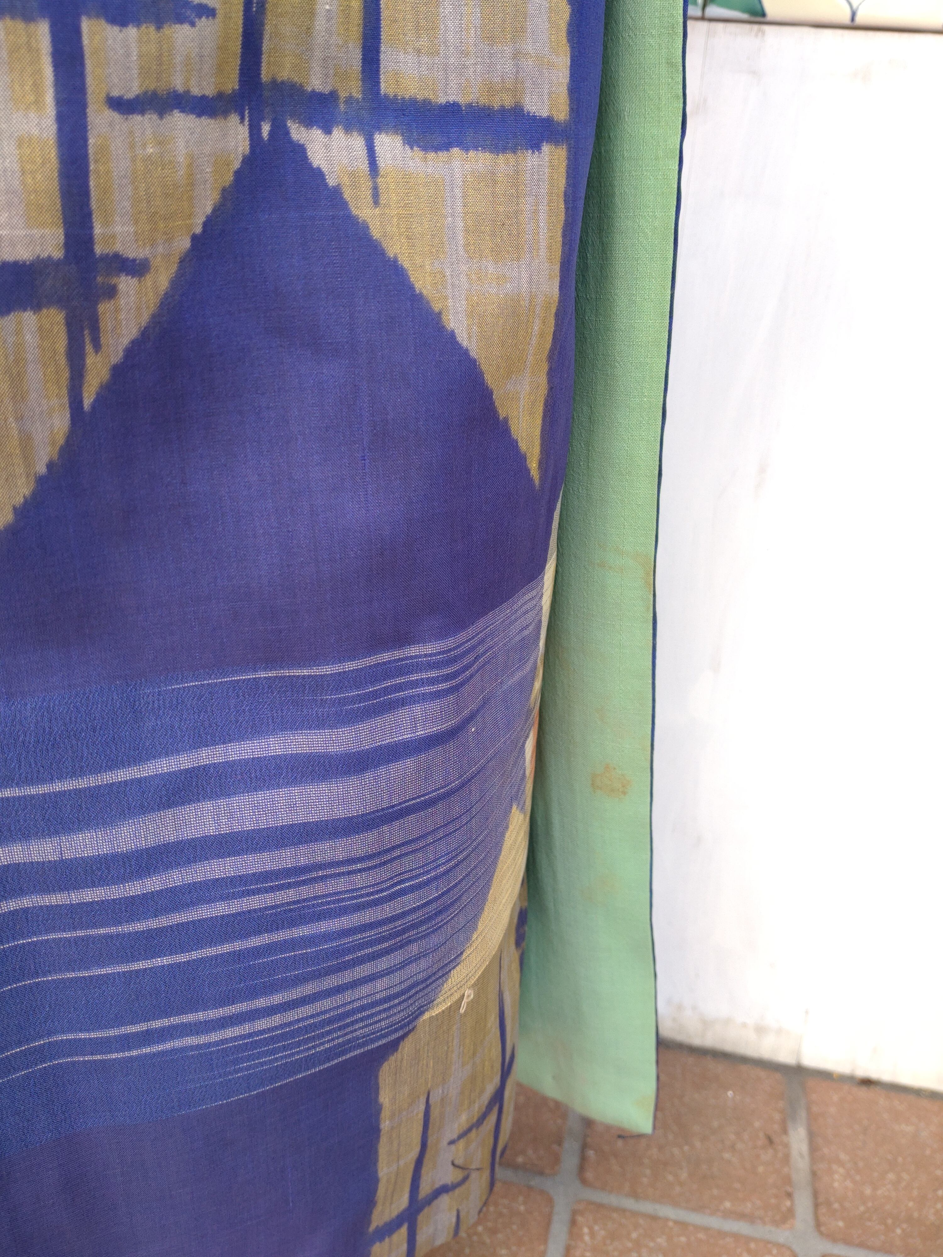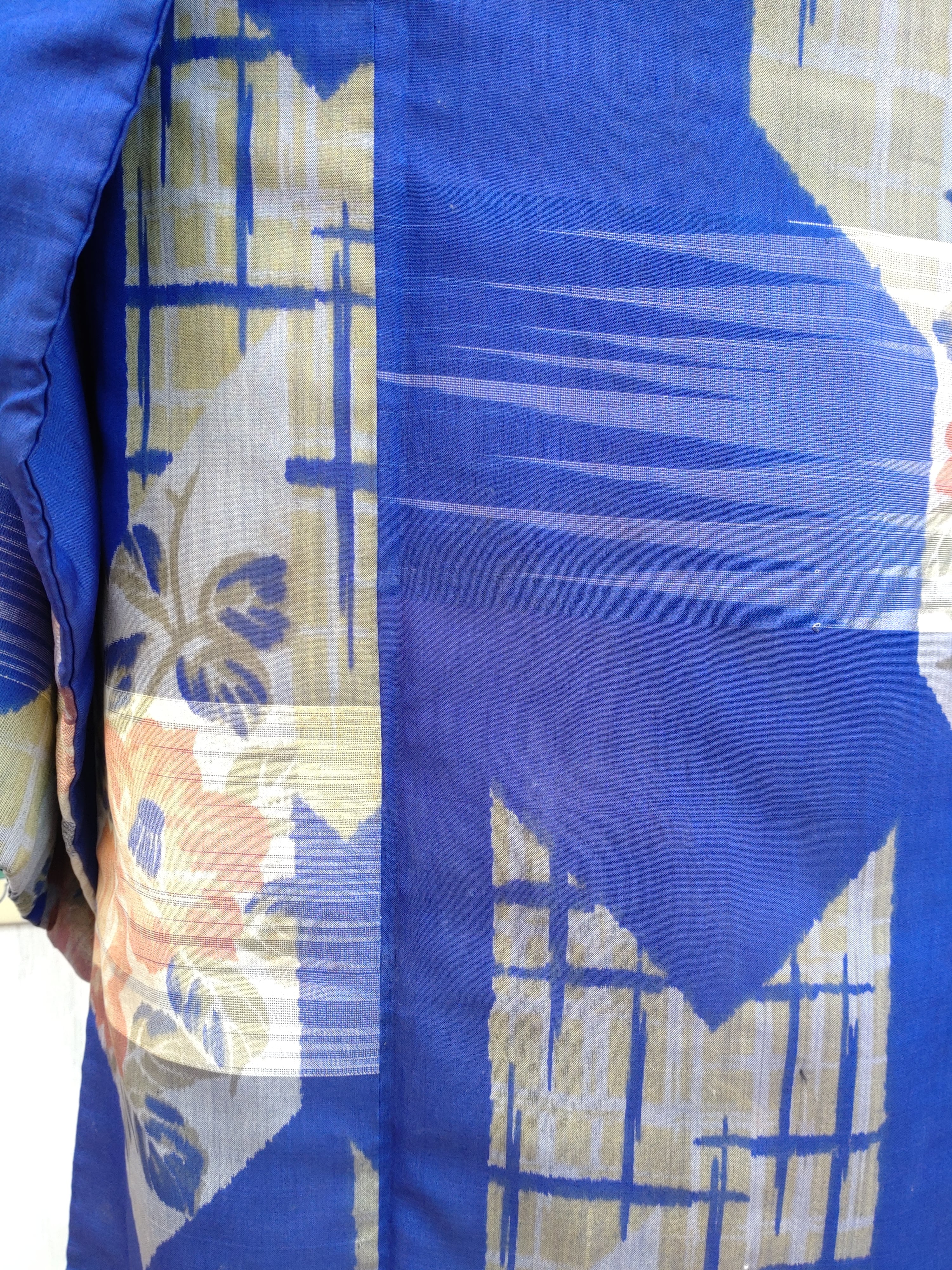 アンティークの銘仙着物です。目の覚めるようなブルーに椿の浮かぶ矢羽根が品のある可愛さです。