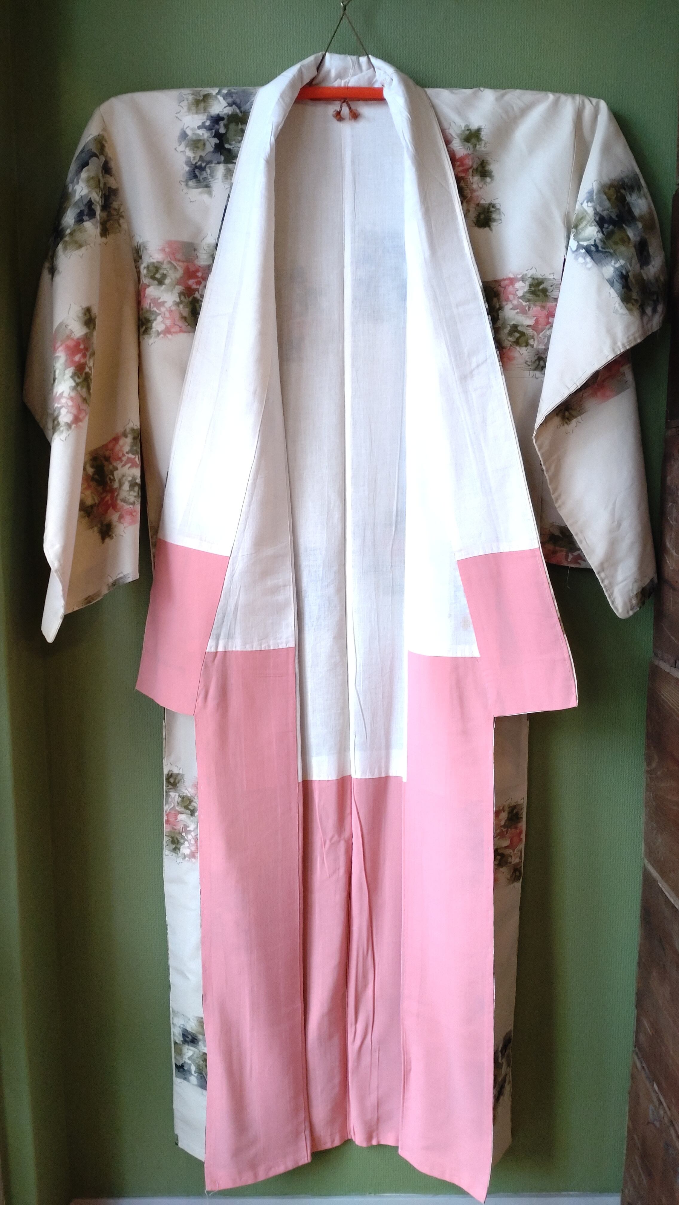 アンティーク銘仙の袷着物です。白地に水彩画のような花柄が品のあるデザイン。