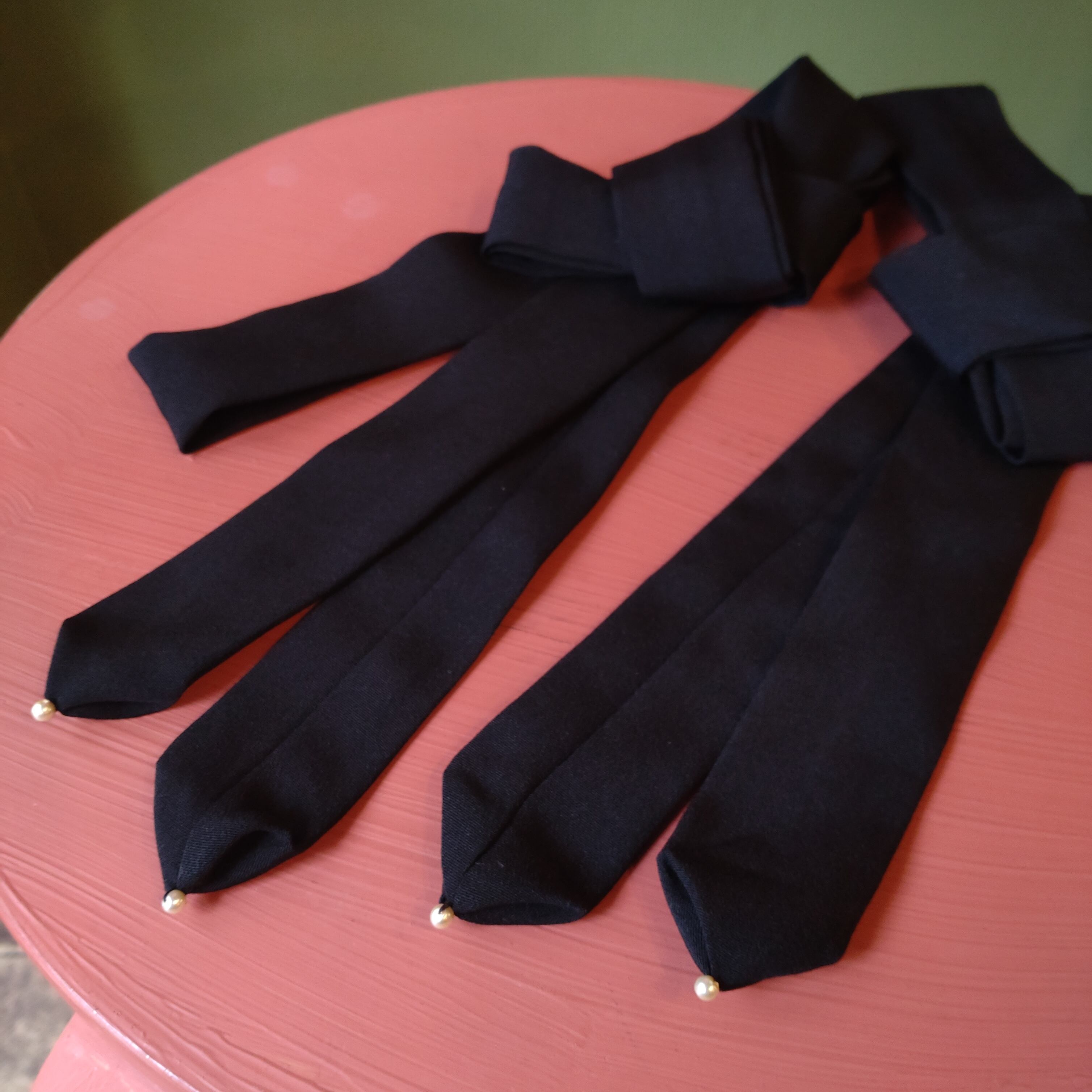 黒い腰紐です。喪服を解体した生地を使用しています。その為紋の部分が表出している場合がございます(表面※縫い目が無い方の側には出ないように作ってあります。)